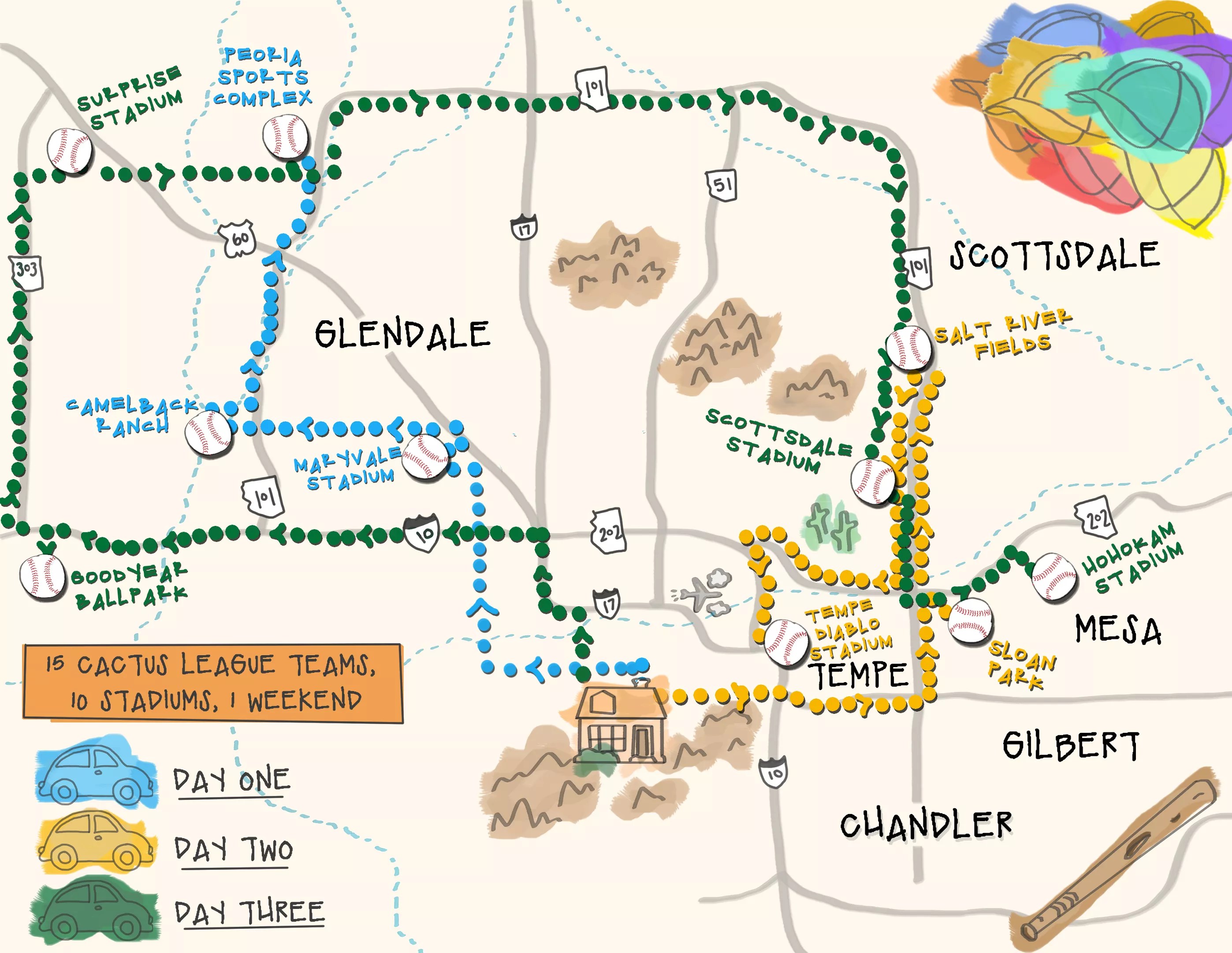 • As I calculated all the possibilities from the Cactus League schedule, I found only one path to success. Three games on the west side on opening day, three games on the east side on the first Saturday, then a frantic final day with two games on each side of the Valley divide.