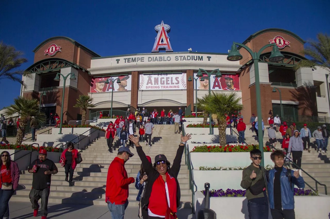 SIXTH STOP: Tempe Diablo Stadium, 2200 West Alameda Drive, Tempe. Opened: 1968. Capacity: 9,558. Home of the Los Angeles Angels. 2017 average attendance: 6,752. The drive: from Salt River, 101 south to the 202, then east on Route 143. Distance: 16.4 miles.