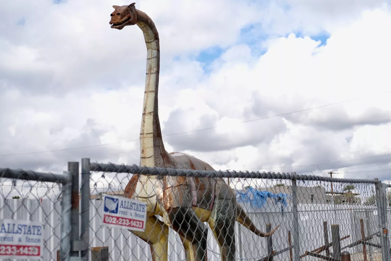 The metal sculptures sit behind fencing along a stretch of Ninth Avenue, where tents had once lined the street. In mid-November, a property owner installed the unauthorized dinosaurs in the right of way after the block was cleared for gas line construction. For weeks, the city of Phoenix and companies in the area refused to identify who was responsible, including for a Phoenix New Times story on December 15.