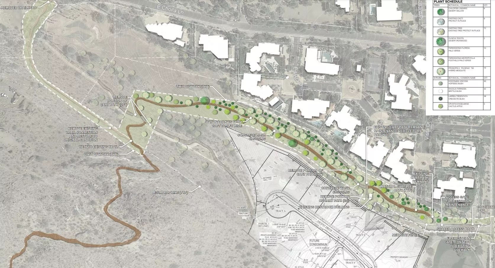 Besides the bathroom and water fountain, the relocation design has hikers entering through what is now a construction road just south of East Vista Drive and walking through a newly constructed trail at one end of The Phoenician’s golf course before connecting with the main Cholla Trail. The rendering shows how the new trail section would have trees for cover, but ideas that are still being discussed include a possible wall separating the hiking rabble from the multi-million-dollar homes they would be near, or a below-grade “cattle chute” that would hide the hikers. Those are apparently secondary considerations. The draft layout of the new trail opening as depicted in the rendering is complete, Bach said, and the final design issue relates to water drainage.