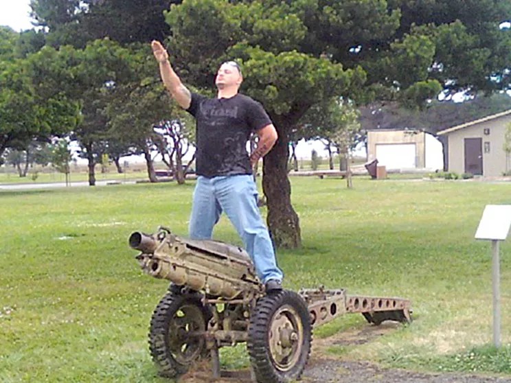 His tattoos speak volumes. On one side of his neck is a swastika, on the other, SS lightning bolts. Thick Gothic script on his forearms proclaims, “Meine Ehre Heisst Treue” (My Honor is Loyalty), the motto of Hitler’s dreaded Schutzstaffel, the black-clad vanguard of the Holocaust.