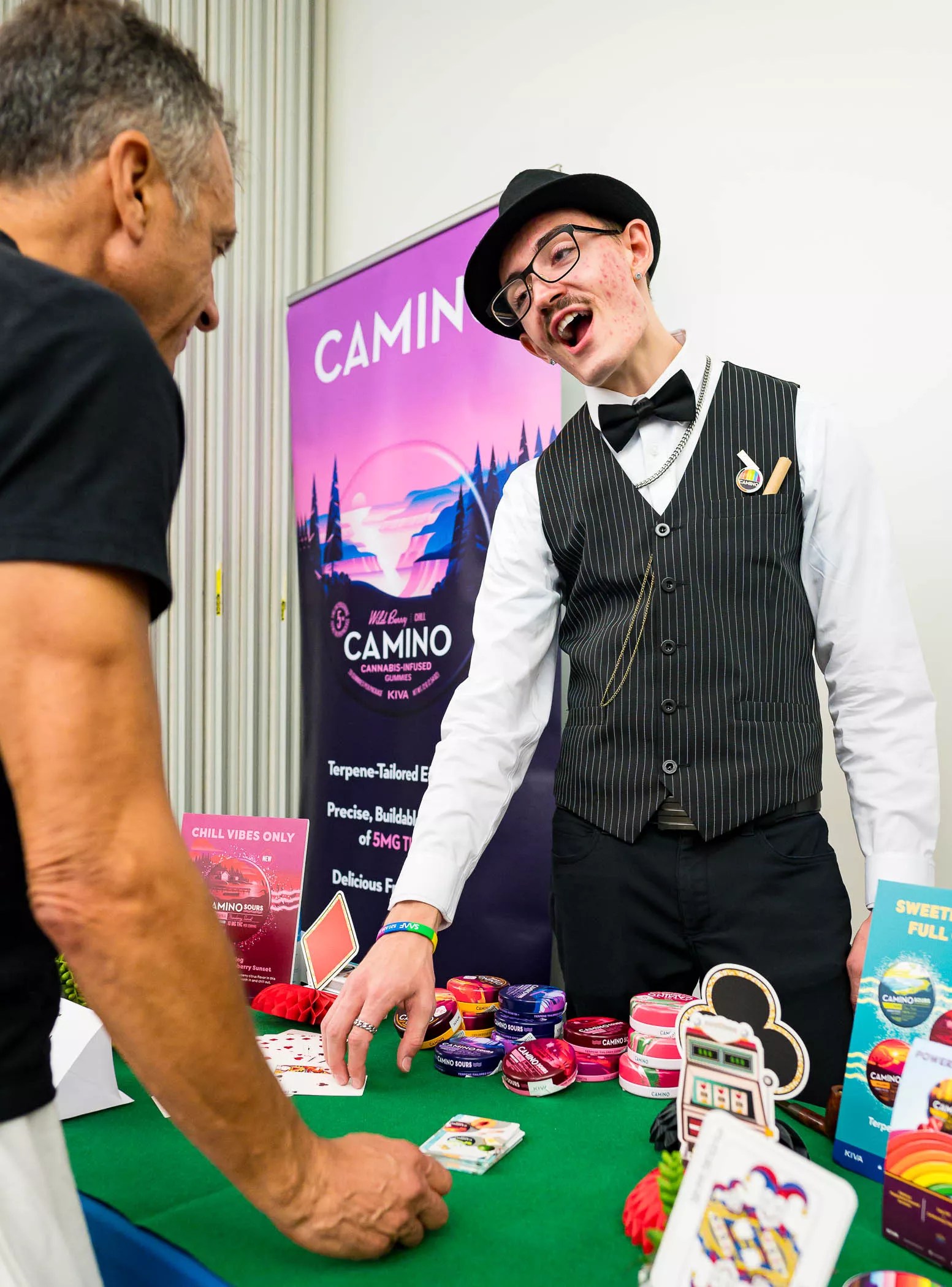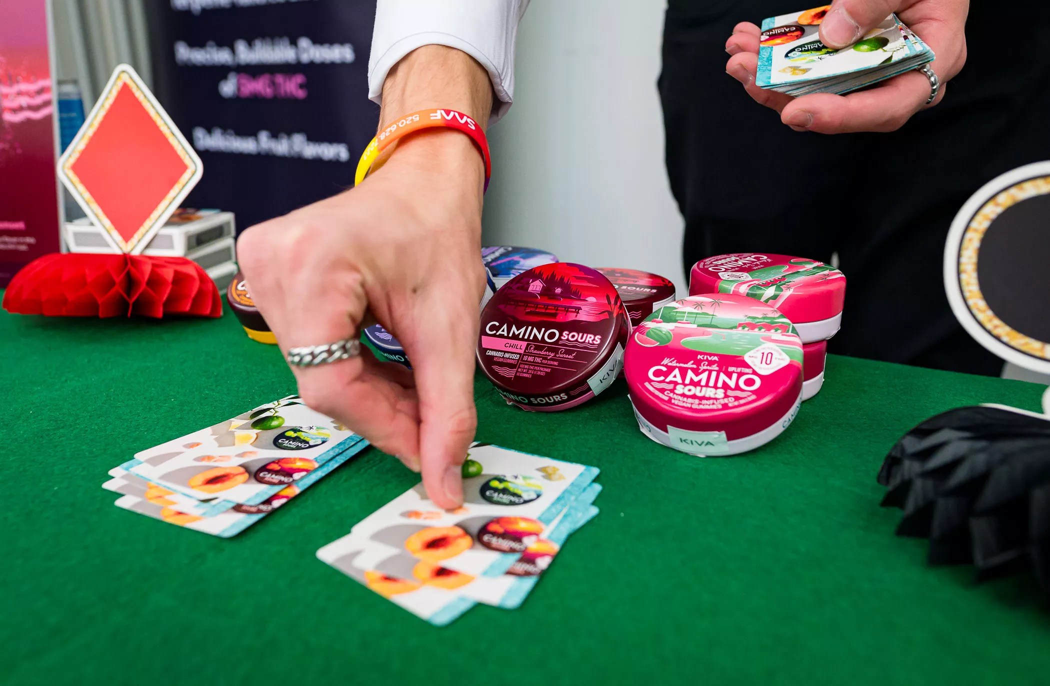 Jacob Macklin plays “War” with attendees that visited the Camino promo table for a chance to win a tin of cannabis-infused gummies.