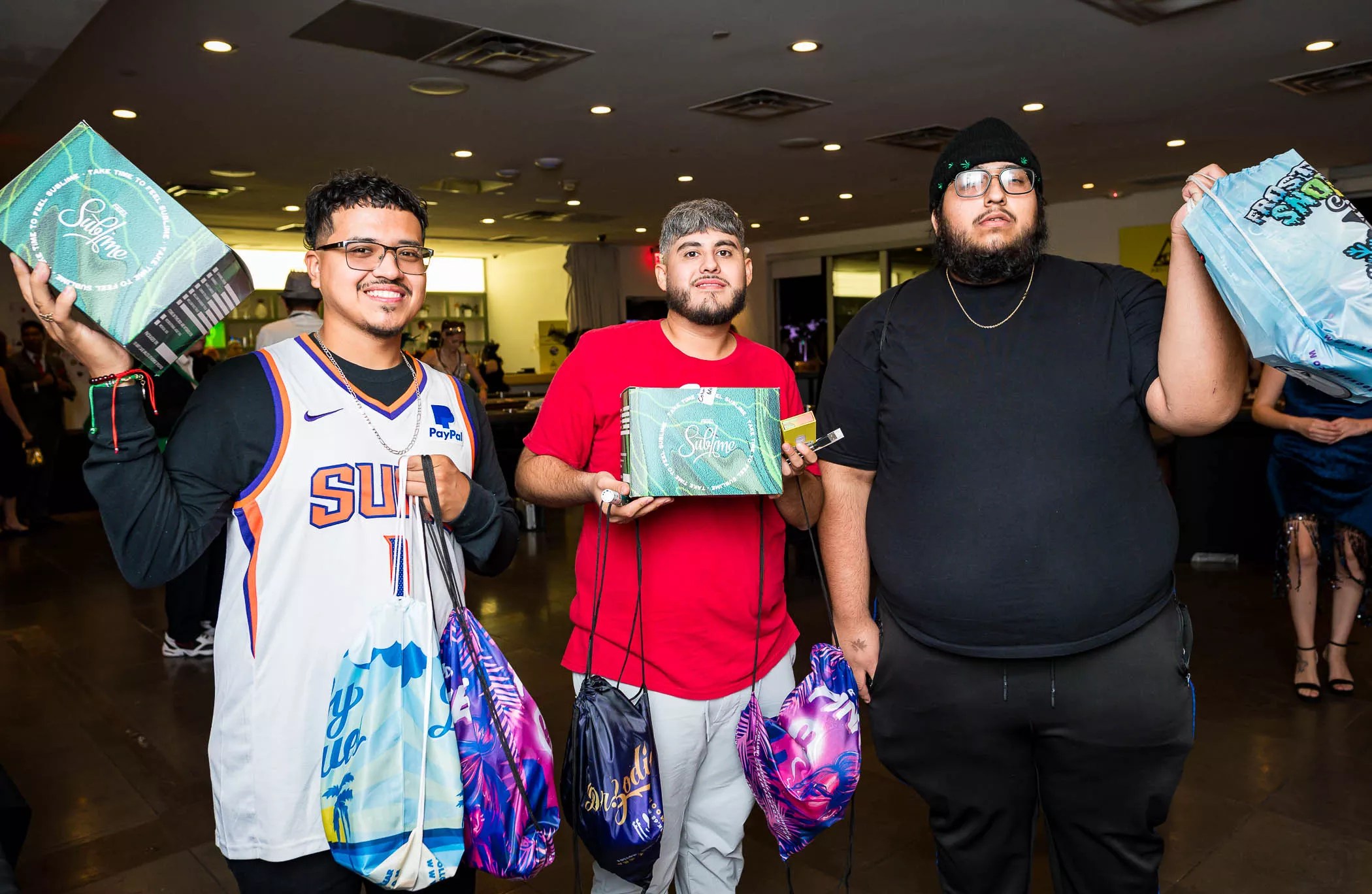 Fernando Rojas, Leonel Rojas and Manuel Arreola showcasing swag and free merchandise provided by sponsors and MITA member companies.
