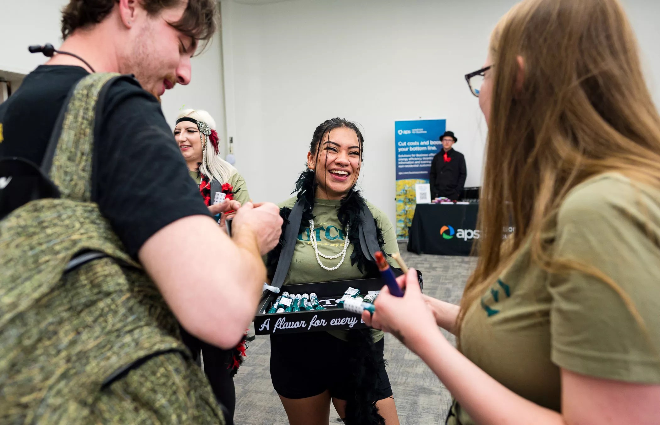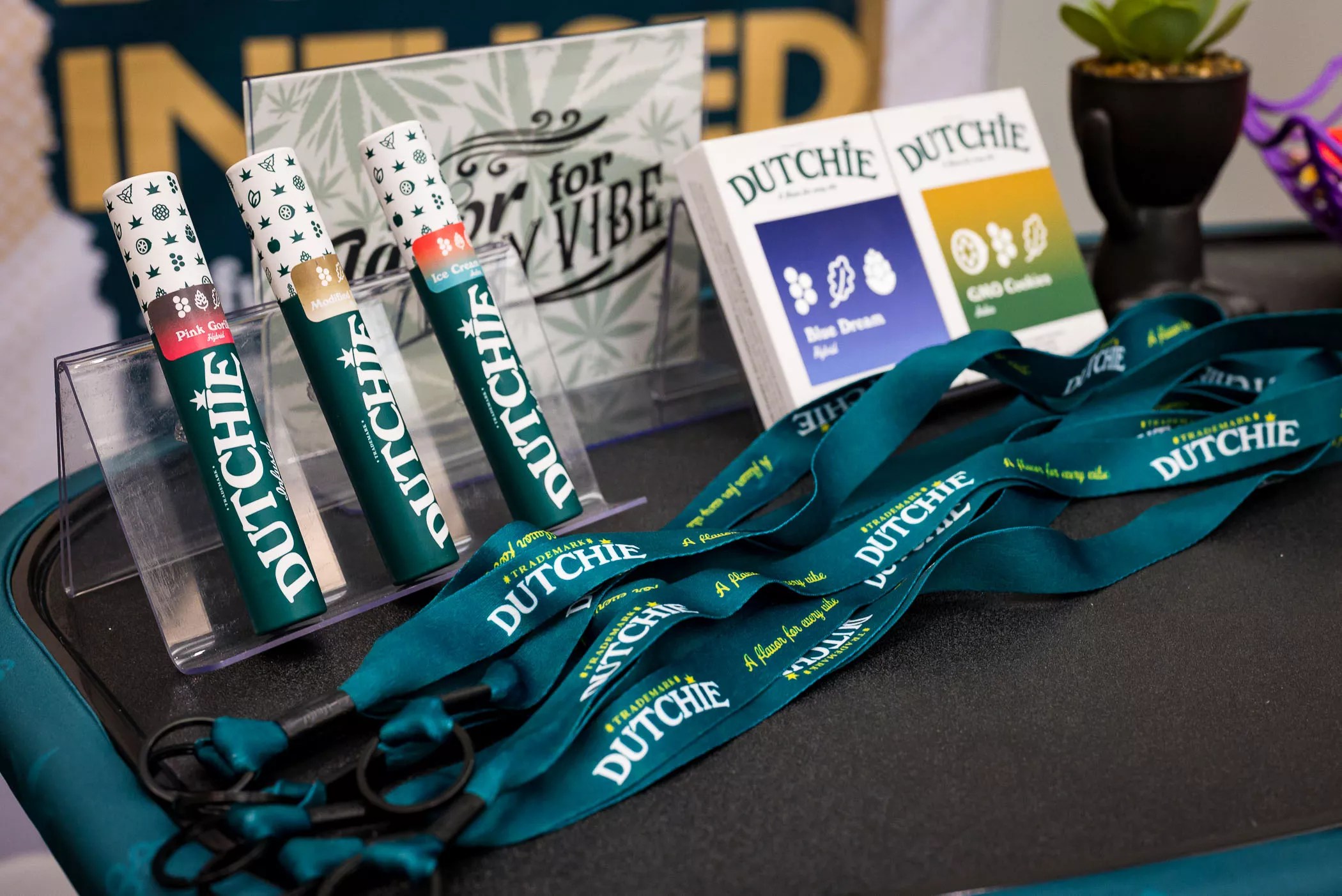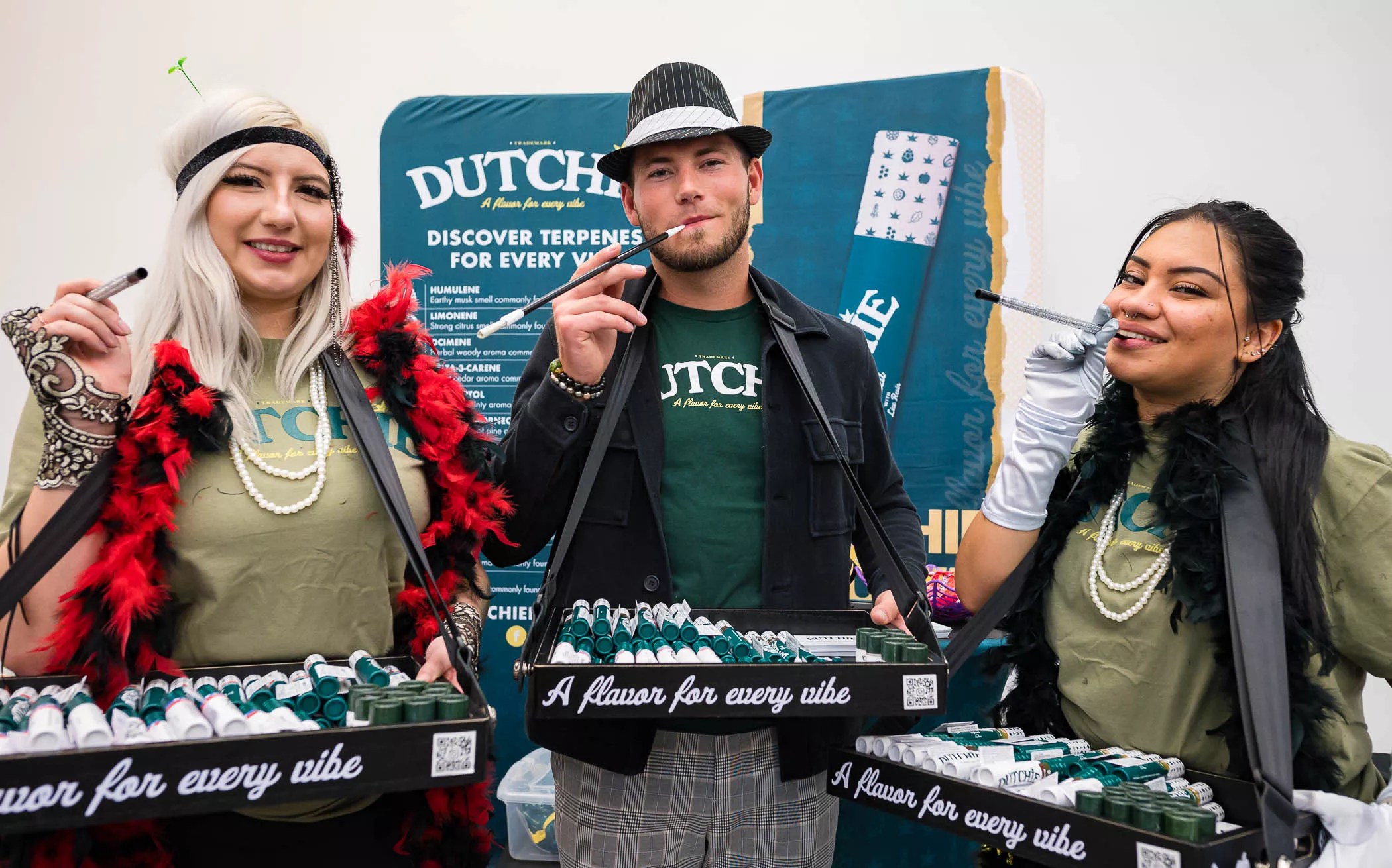 Alyssa Carter, Wes Donahoe and Laura Gonzalez offering guests free pre-rolls from Dutchie.