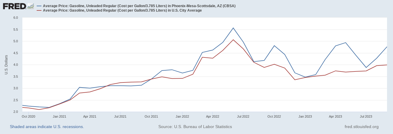 Phoenix drivers and businesses have paid well above the national average for gasoline this year, with prices spiking in two waves over the summer, according to data from the U.S. Bureau of Labor Statistics. In March, gas prices in Arizona were the fifth-highest in the nation. But the average price for unleaded regular gas peaked at $4.94 in May before dropping and leveling out at $4.76 in September. On Oct. 12, the national average was $3.64, said AAA.
