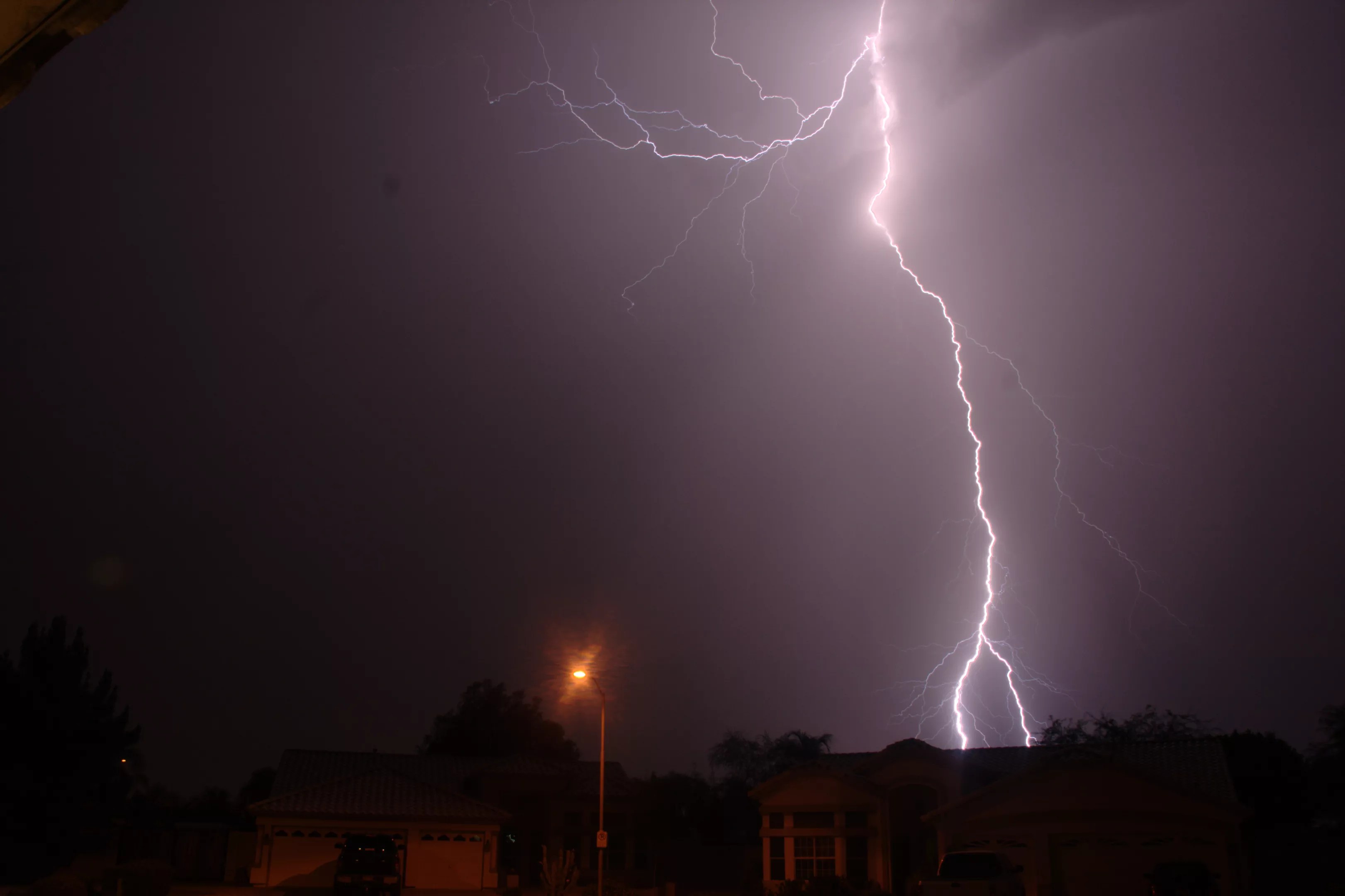 The much-anticipated first monsoon of the season hit Phoenix Monday night, whipping droplets of rain through the air and scattering strips of palm fronds and other debris around the roads. Lightning streaked brilliantly across the sky.