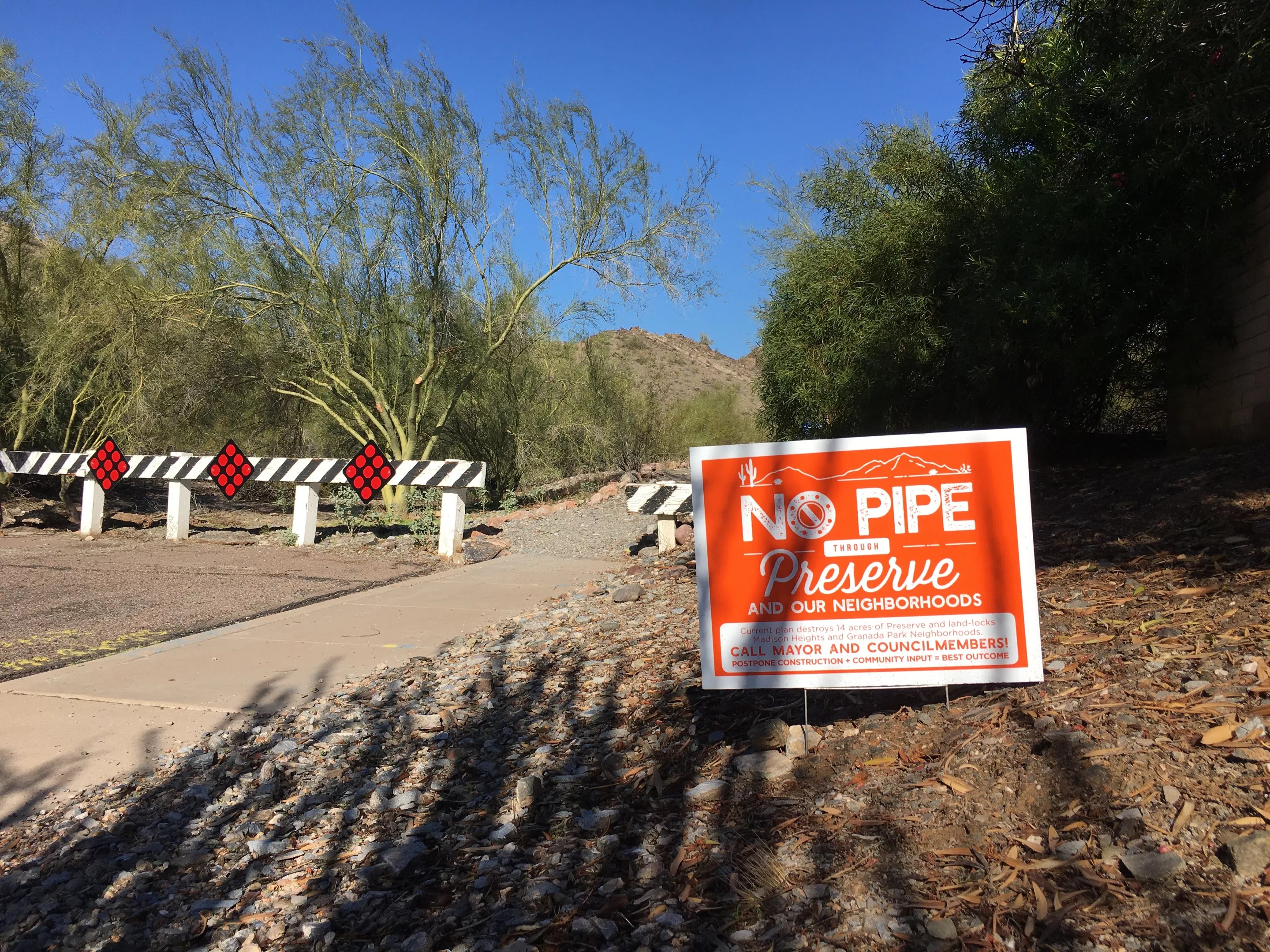 A sign opposing the drought pipeline sits outside an entrance to the Phoenix Mountain Preserve, which the pipeline would tunnel through.