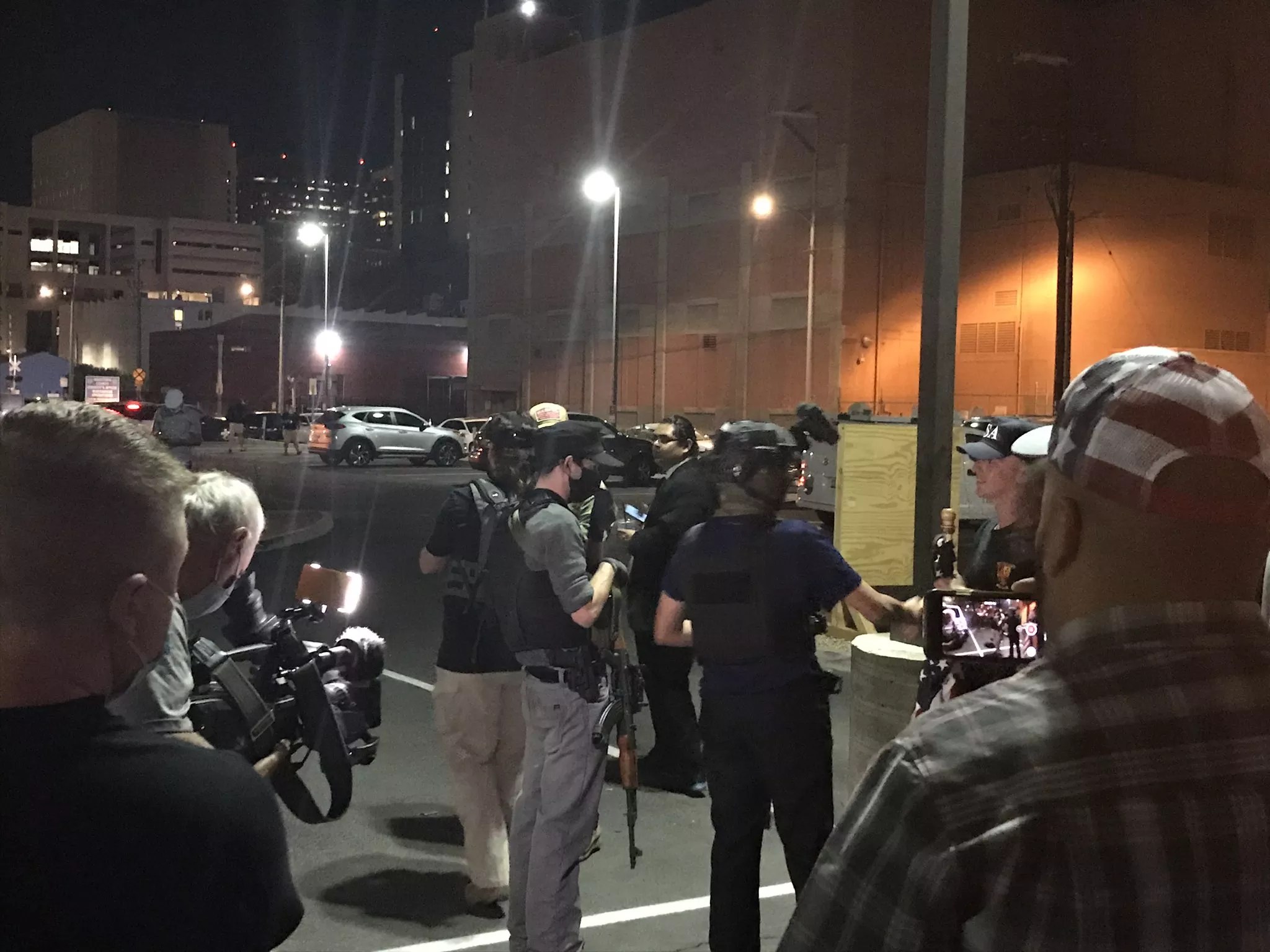 By around 11 p.m., the scene had calmed down and the crowd had halved. Most of those who remained were crowded around a young woman who was arguing with them while her friend live-streamed. Four armed men with tactical gear posed for a news camera in the back of the parking lot.