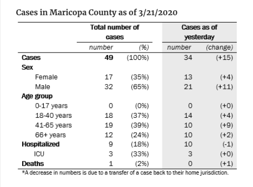 In Maricopa County, 15 additional people have tested positive for COVID-19 since Friday, bringing the countywide total to 49. Maricopa County has community spread of the virus (meaning the source of the infection is unknown) and has the state’s highest concentration of cases.