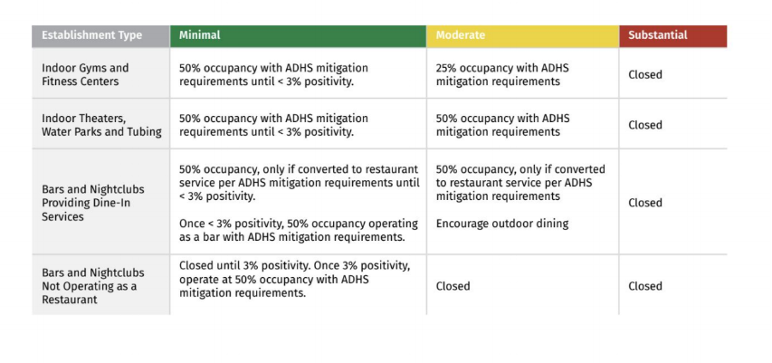 Even once counties reach “minimal” spread, bars will remain closed until test positivity drops below 3 percent.
