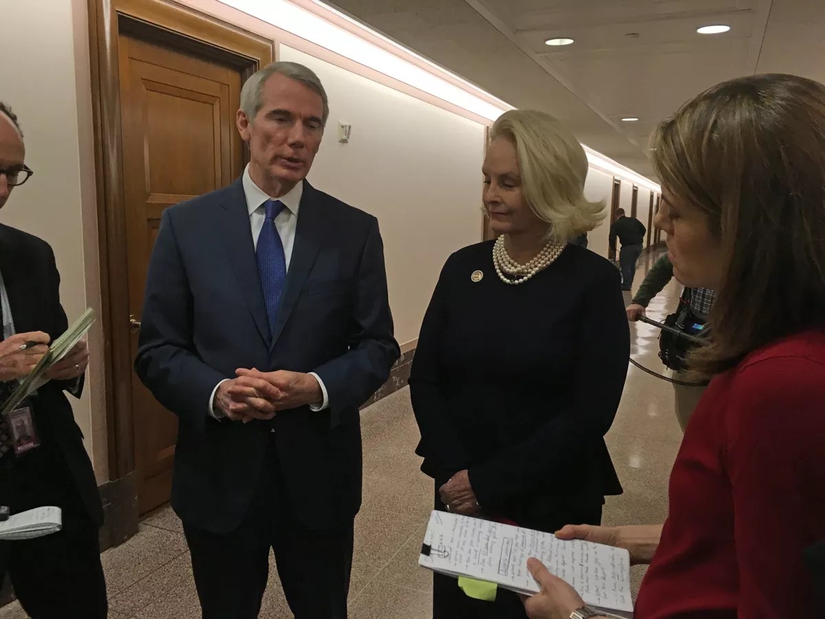 Republican senator Rob Portman of Ohio, chairman of the Permanent Subcommittee on Investigations (left), and anti-trafficking crusader Cindy McCain, whose husband, Arizona Senator John McCain, is a subcommittee member.