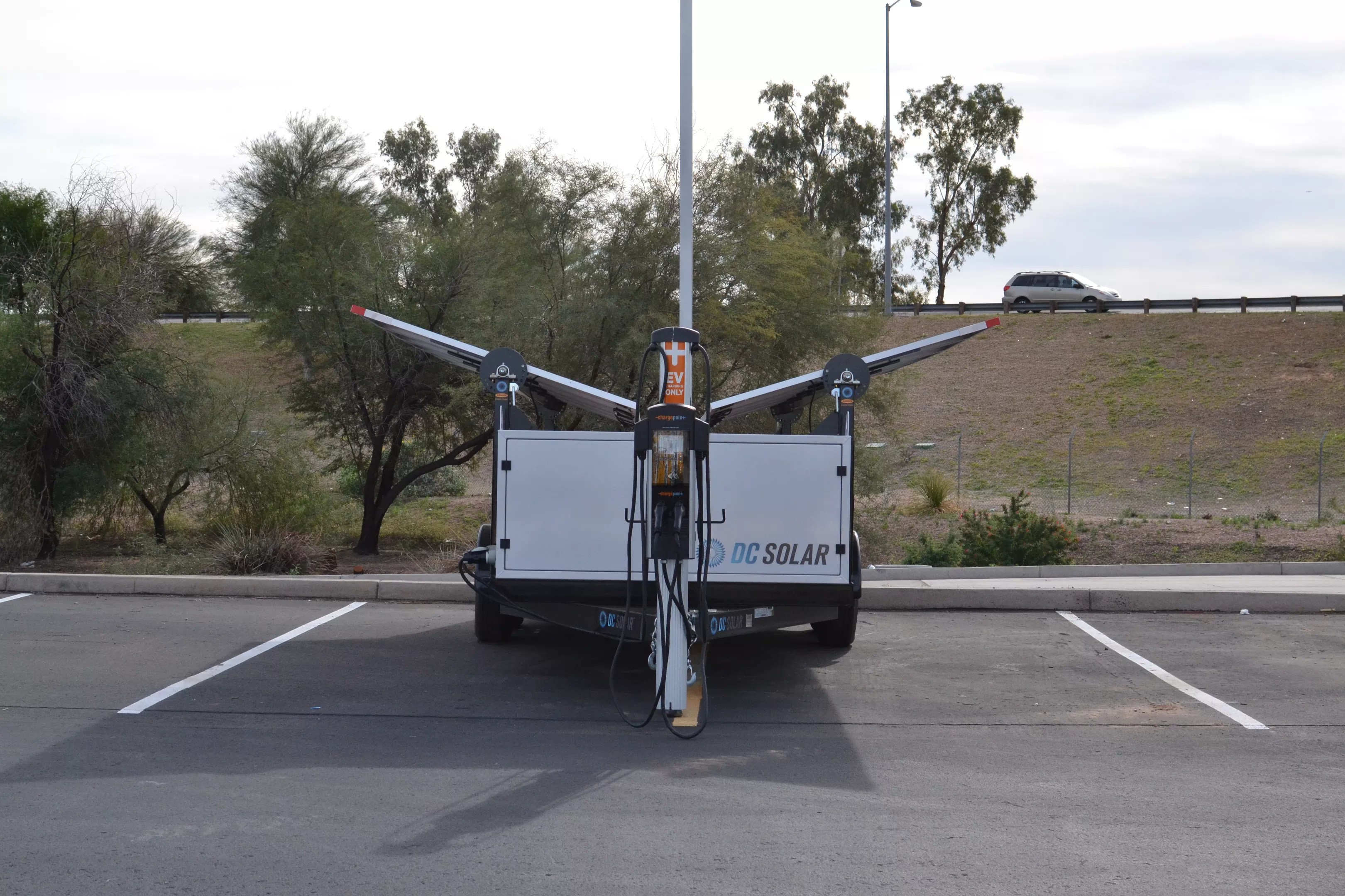 Each unit is a flatbed trailer topped with solar panels that tilt down toward the center of the truck, making a shallow V. The head of the trailer looks like a gas-station hookup, only it dispenses electricity. Each trailer takes up two parking spaces. Their sides are overtaken with a logo that, for now, reads “DC Solar.”
