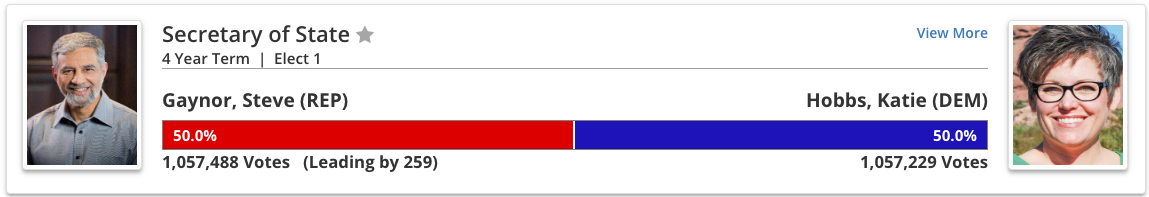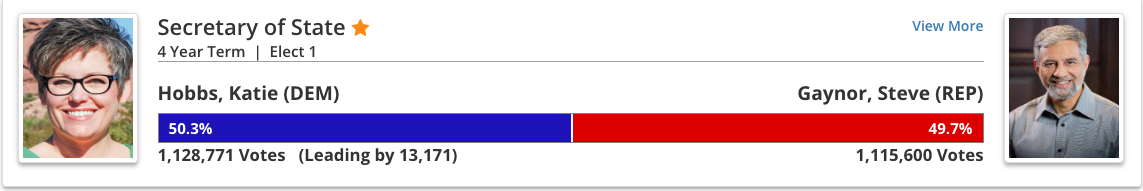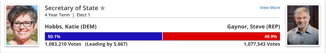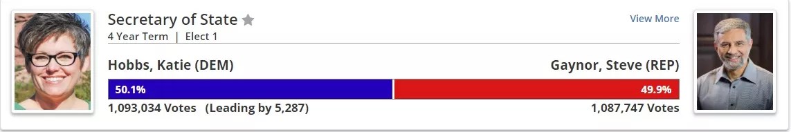 The latest ballot count (see below) had Hobbs leading Gaynor by more than 13,000 votes, with 92,000 ballots left to process in Arizona.