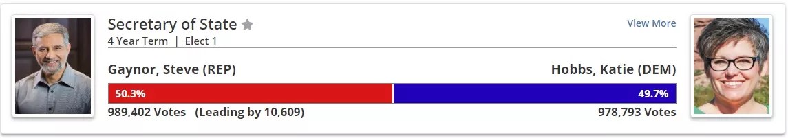 Update, 5:15 p.m., November 13: Democrat Katie Hobbs continues to lead Republican Steve Gaynor in the race for Arizona Secretary of State. She is ahead by 5,287 votes. On Monday night, the Associated Press retracted its election-night call that Gaynor had won the race.