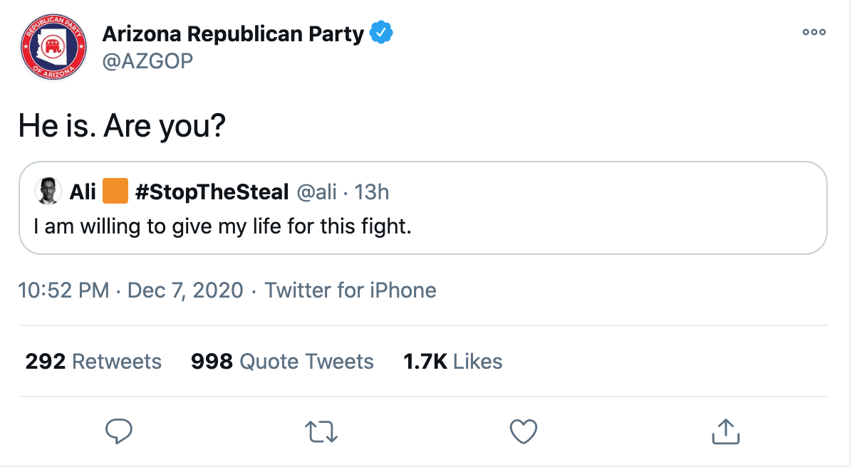 In a series of tweets posted last night and early Tuesday morning, the Arizona Republican Party incited violence and encouraged its supporters to give their lives in the fanciful effort to overturn the presidential election results.