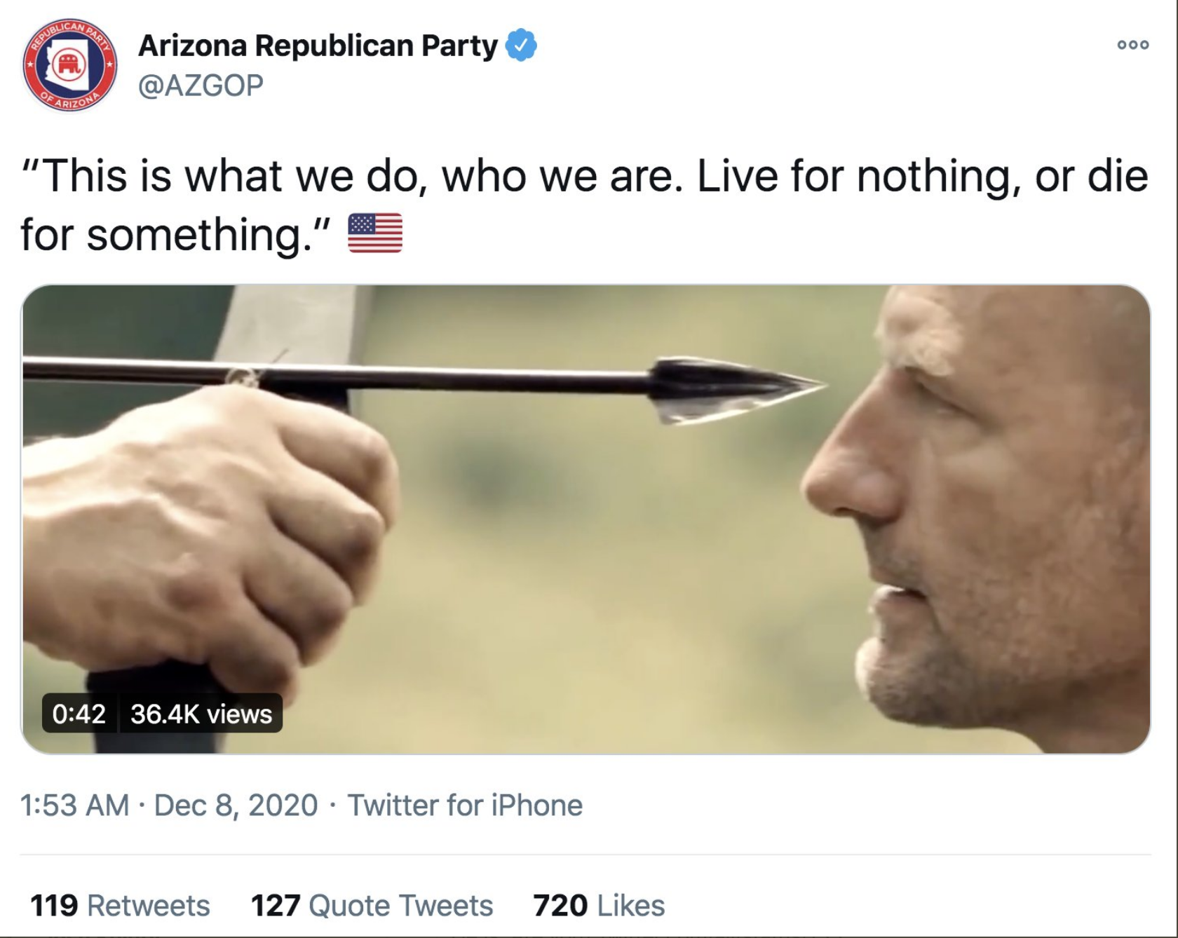 In another tweet posted a few hours later at 1:52 a.m. on Tuesday morning, the Arizona Republican Party included a Rambo movie clip with the quote, “This is what we do, this is who we are. Live for nothing, or die for something.”