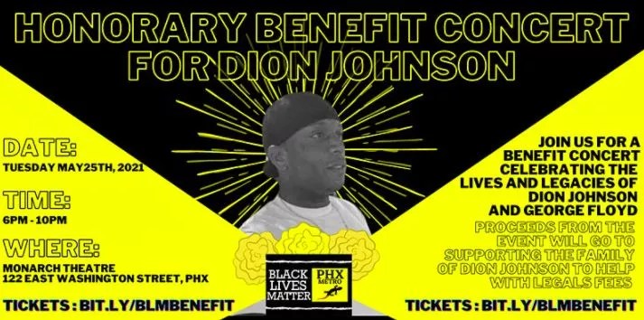 The Honorary Benefit Concert for Dion Johnson, hosted by Black Lives Matter Phoenix Metro, is scheduled to take place tonight from 6 p.m. to 10 p.m. at the Monarch Theatre, 122 East Washington Street. Donations are being encouraged “and we hope to collect an abundant amount to redistribute to Dion Johnson’s family,” a flyer for the event states. The group hopes to raise enough money to hire a lawyer who can help bring Donovan home to get counseling.