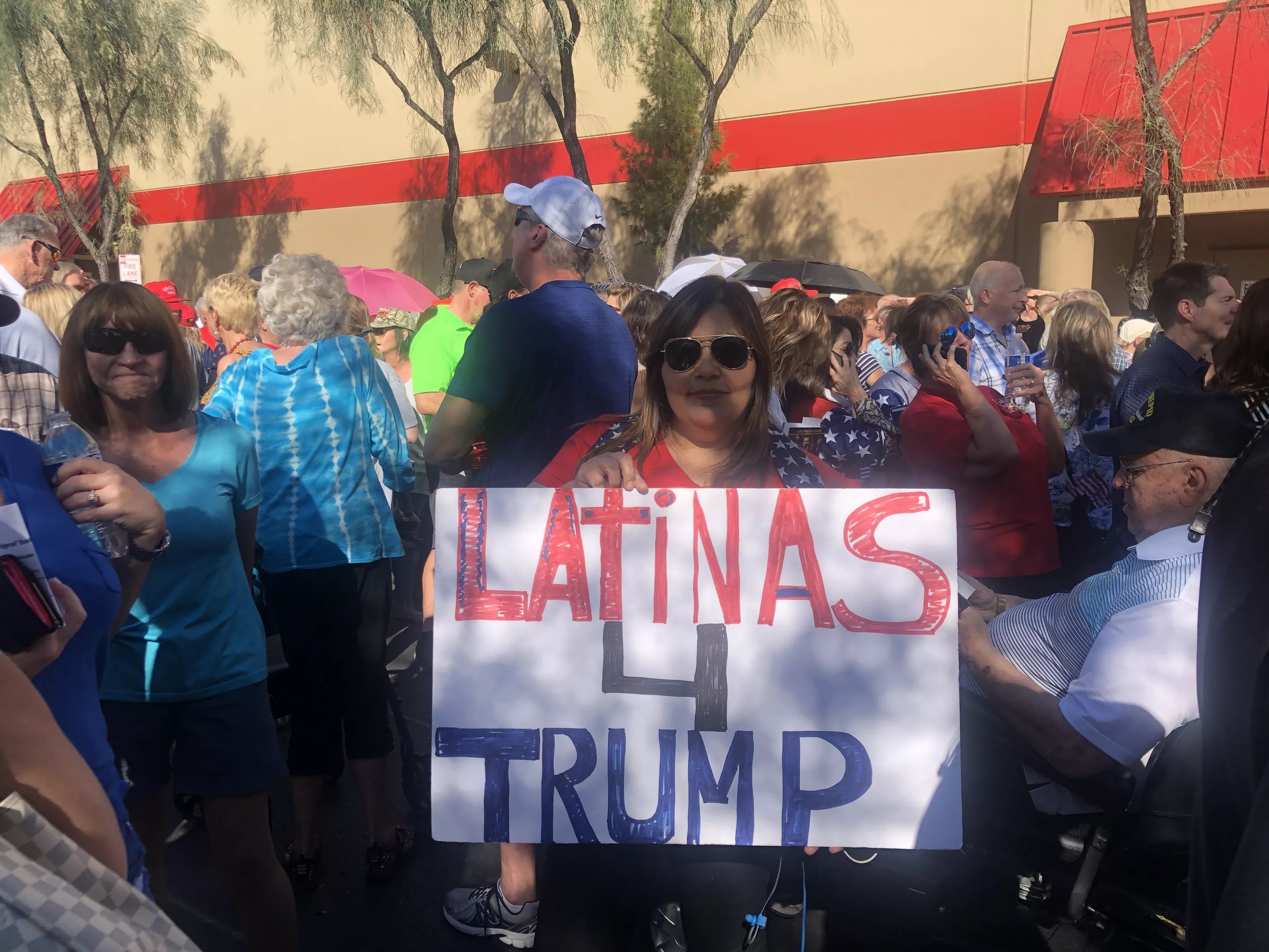 Mesa resident Teresa Mendoza holds her “Latinas 4 Trump” poster in line at Monday’s book signing.