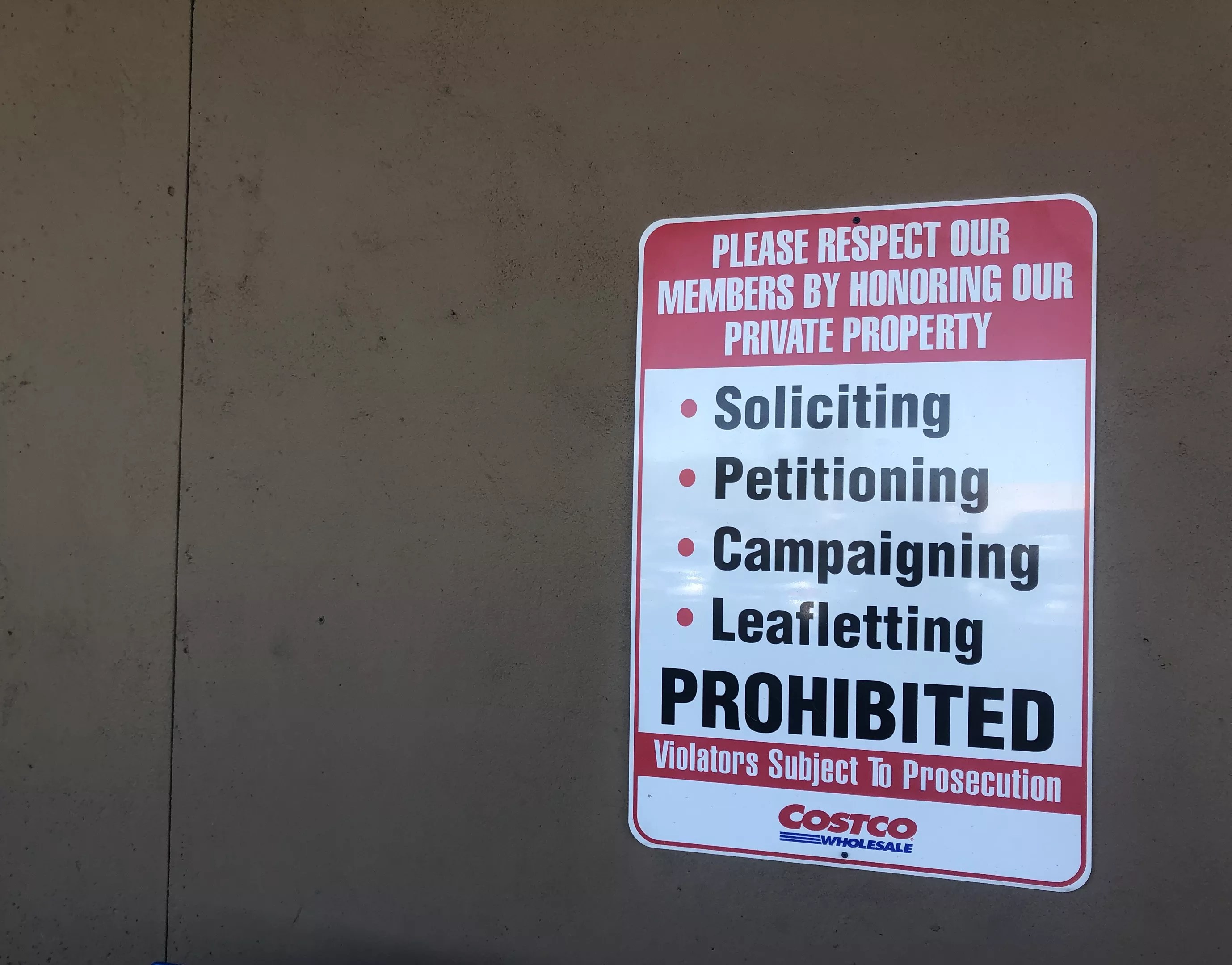 Costco’s north Scottsdale store location has a posted sign banning soliciting, petitioning, campaigning, and leafletting on its property, and a policy on its website confirms that.