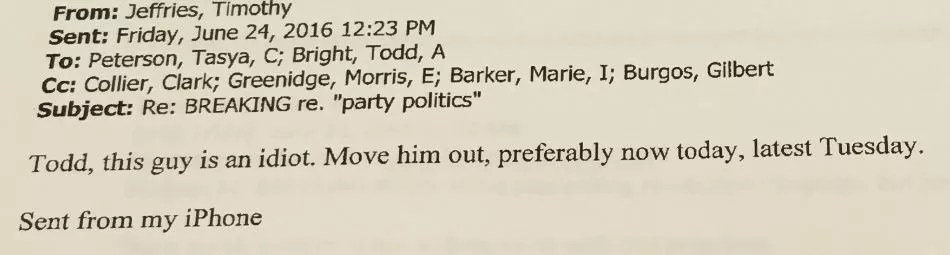 “Todd, this guy is an idiot,” Jeffries told Bright, 17 minutes after Hall sent his second e-mail. “Move him out, preferably now today” [sic].