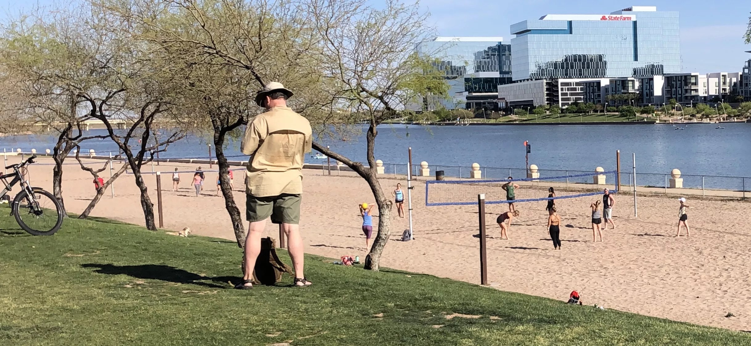 People playing volleyball by Tempe Town Lake on March 29, 2020.