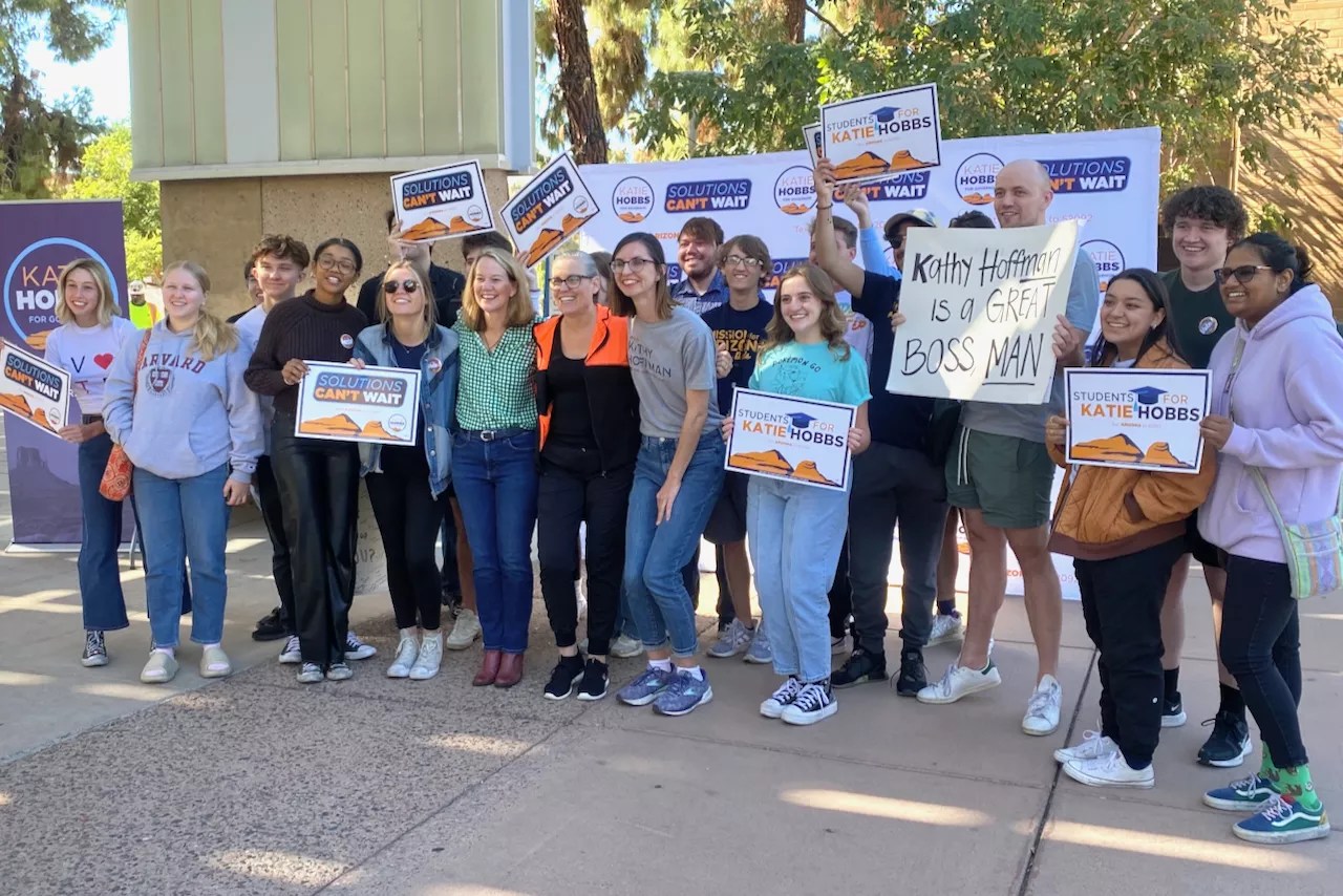 Katie Hobbs, the Democratic nominee for governor, arrived about 10 minutes later. She met with a horde of students who sought photos and answers to questions. Kathy Hoffman, the Democrat seeking re-election as state Superintendent for Public Instruction, also joined the event.