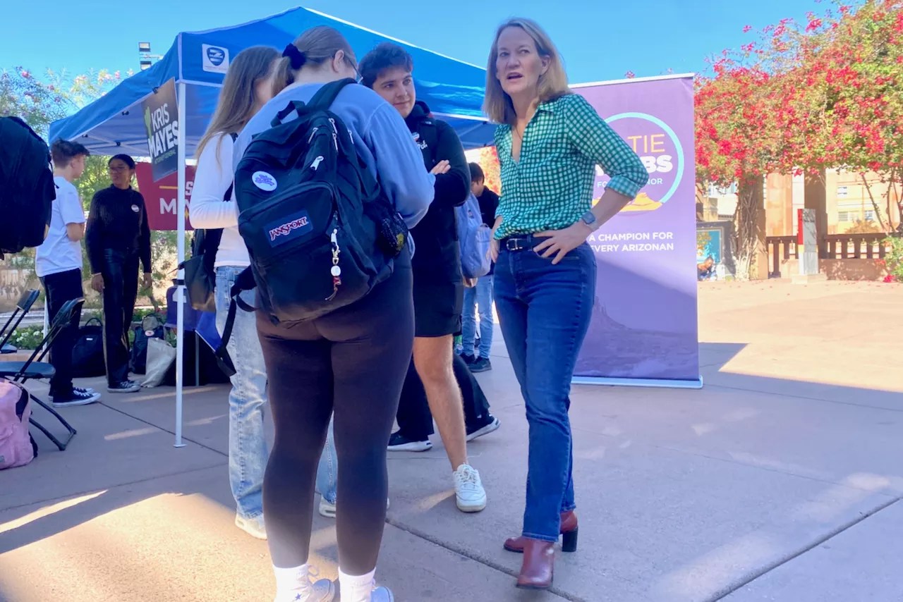 Kris Mayes, the Democratic candidate for attorney general, arrived at about 11 a.m. and chatted with students. A young man who said he’s registered to vote in California shook hands with Mayes and enthusiastically told her about his passion for politics. Another student asked for a quick comment for his TikTok, and Mayes obliged. She told his followers to “get out and vote.”