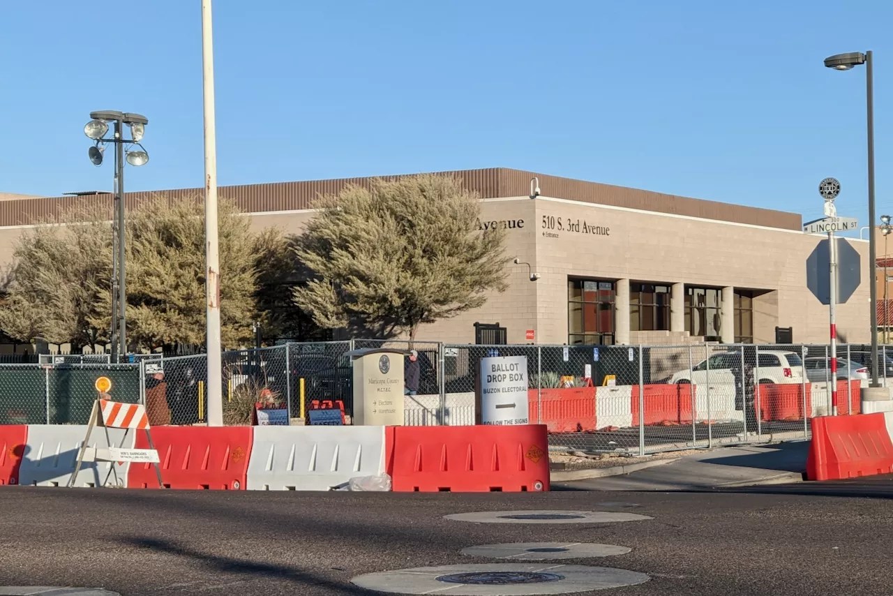 The 24-hour ballot drop box at the elections command center in downtown Phoenix – one of several in Maricopa County at the center of a legal battle – was surrounded by fencing and barricades on Tuesday morning. But all was calm.