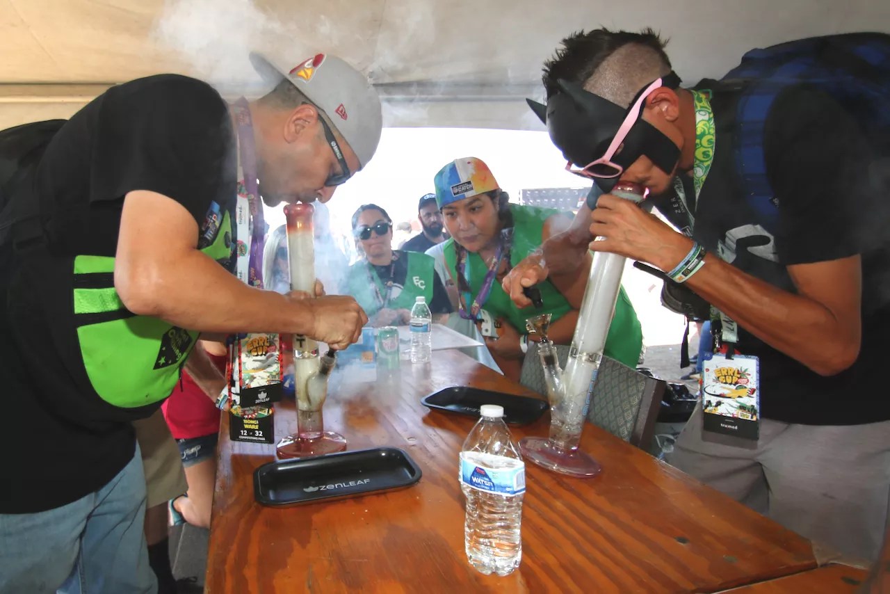 Freeland competed against Marco, who wore old-school black sunglasses. He didn’t say a word to New Times; he was in a zone. Marco flipped his hat backward so his bill wouldn’t interfere with his bong hits and, with that, seemingly activated his cannabeast mode. The two squared up with only a 6-foot wooden table with two 3-foot glass bongs separating them. They might just be the fastest bong rippers in the Valley.