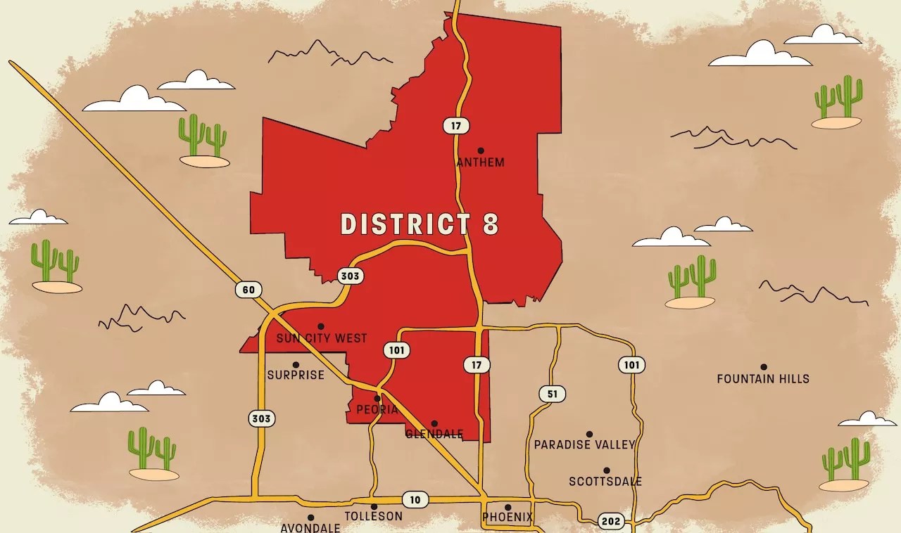 District 8 covers Sun City, Sun City West, large swaths of Glendale and Peoria, portions of Phoenix and a chunk of land north of the Valley following Interstate 17 and nearly reaching Black Canyon City.