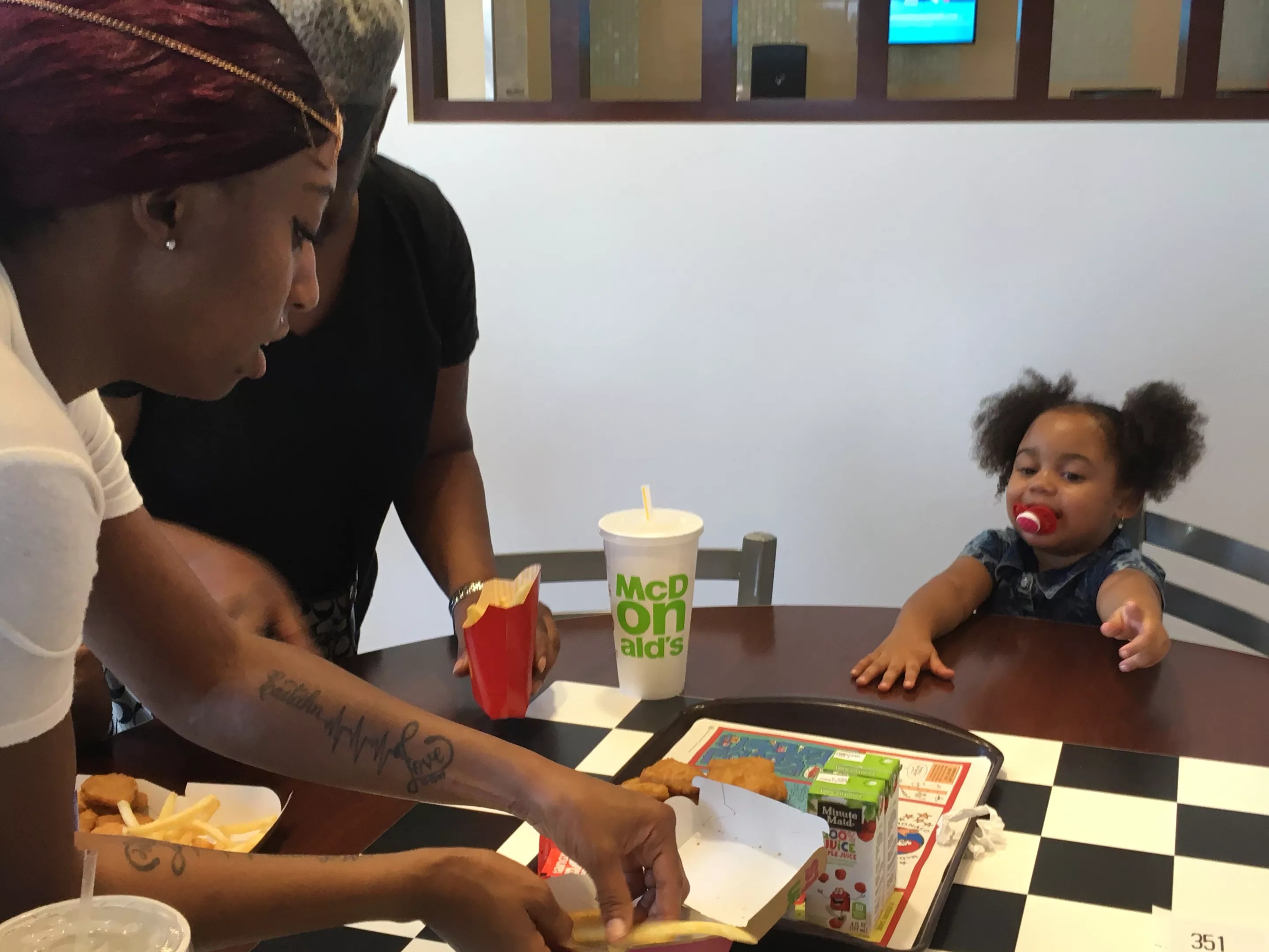 Brianna Huey divides up McDonald’s chicken nuggets and French fries for her two children, Eastahn and Melianna. Melianna is allowed limited solid food because she has a hole in her throat that prevents her from swallowing properly. She is primarily fed through a feeding tube.