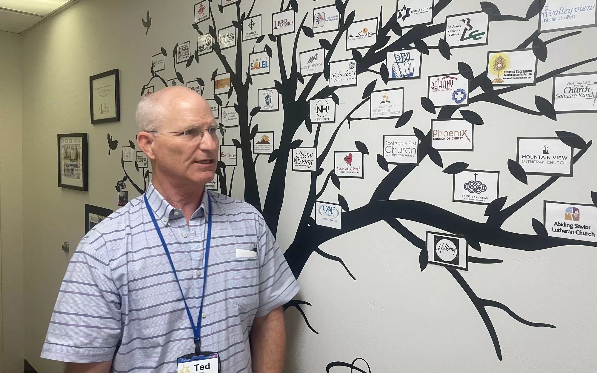 Family Promise of Greater Phoenix CEO Ted Taylor stands in front of a wall displaying all the organization’s partners across the Valley.