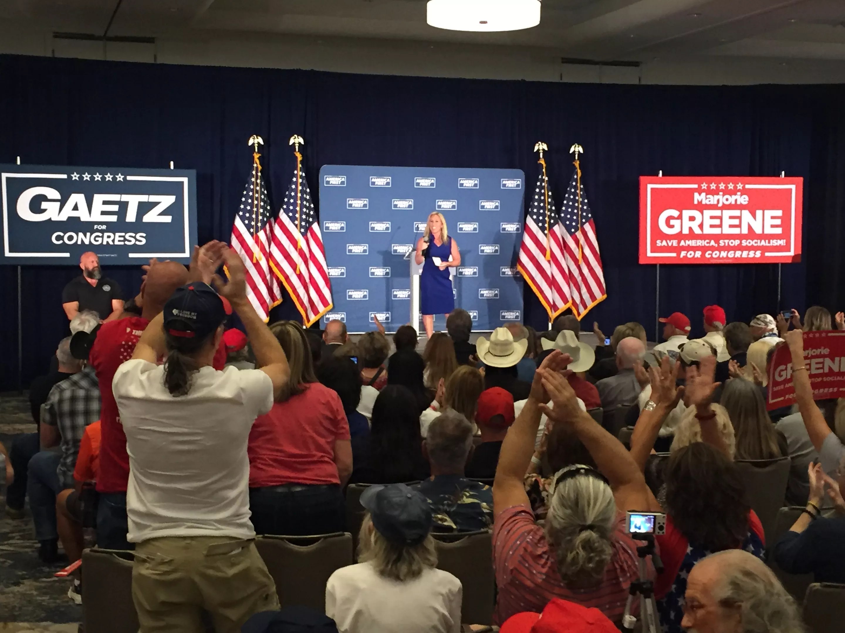 The crowd applauds Representative Marjorie Taylor Greene at the Delta Hotels Phoenix Mesa.