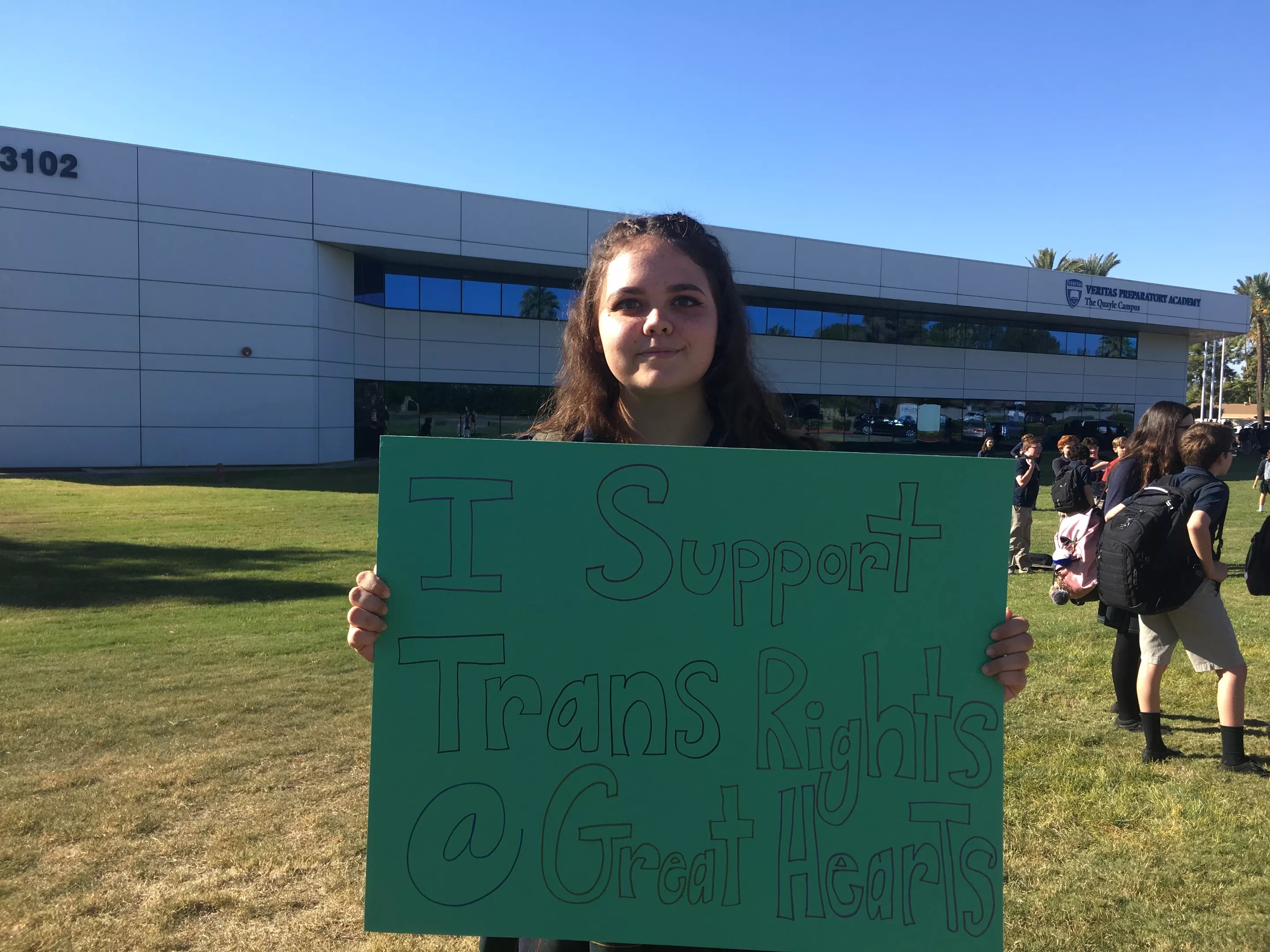 Some students were happy to grab hold of signs with messages condemning Great Hearts’ policy, which prohibits transgender students from using bathrooms and facilities that correspond with their gender identity, or their internal sense of being male, female, or something else. The rules dictate that students must follow the “uniform code and grooming standards” of the sex listed on their birth certificate, and don’t require teachers to call students by their preferred name and pronouns.