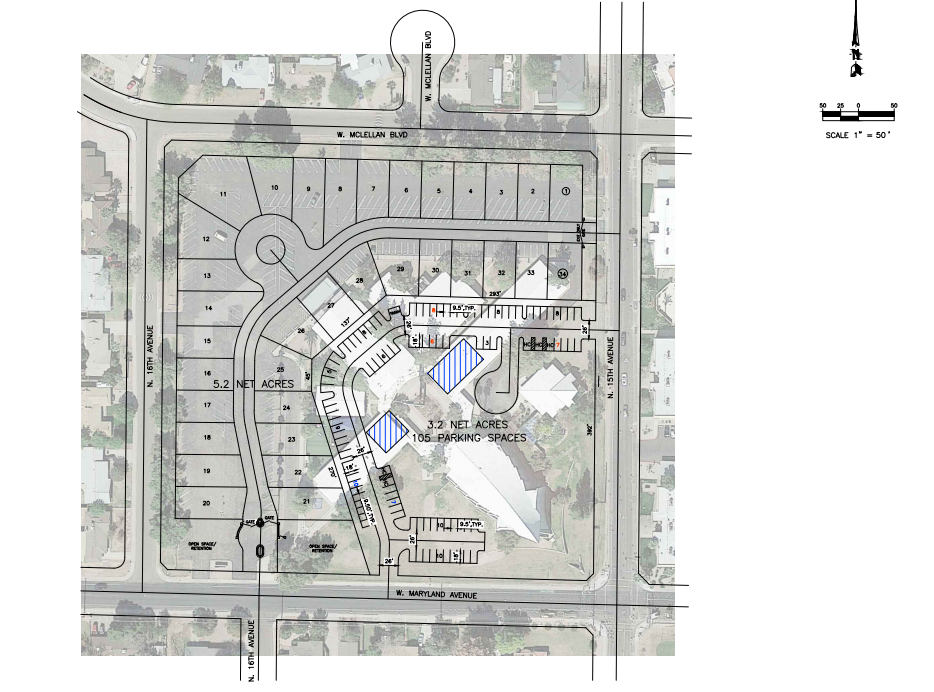 Subdivisions would replace the parking lot, several buildings, and the giant pine trees behind Phoenix’s Shepherd of the Valley Lutheran Church.