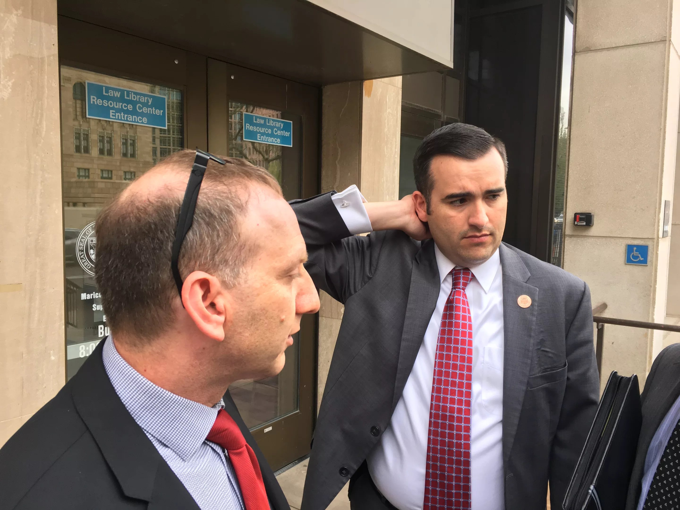 Joe Kanefield (left) and T.J. Shope (right) confer outside a Maricopa County courthouse moments before David Stringer resigned.