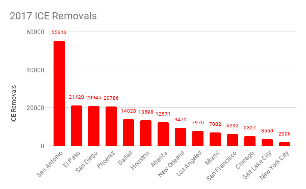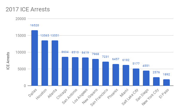 The biggest jump in ICE arrests was in Florida, where 6,192 people were arrested, a 76 percent increase from 2016. While you might think that states on the U.S.-Mexico border would see an ICE crackdown under Trump, the other regions that experienced a spike in ICE arrests are counterintuitive. Dallas and Oklahoma had a 71 percent increase, Louisiana and its neighbors saw a 54 percent jump, and the Atlanta region spiked by 53 percent.