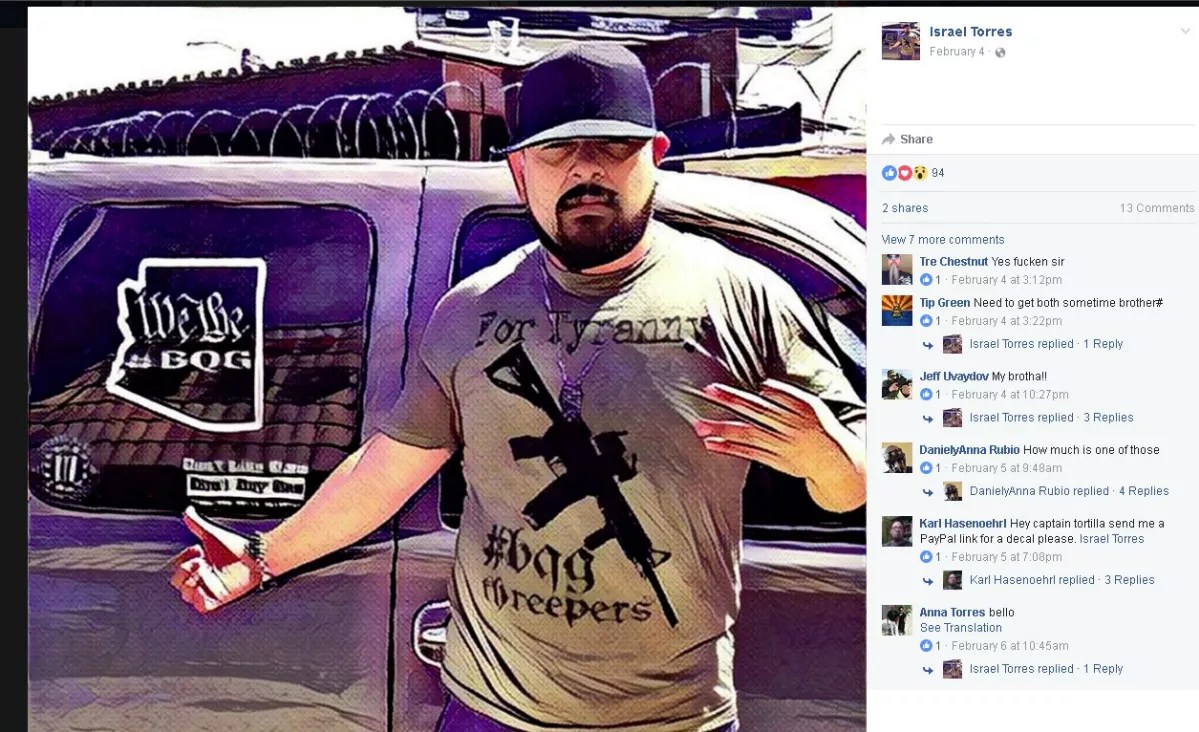 Reached by phone, a member of Torres’ immediate family declined comment. However, posts made by members of the Torres family to the private Facebook group #BQGHQ ARIZONA ask for financial help, stating that the “Feds raided his home,” confiscating everything “2A related,” 2A being shorthand for the Second Amendment.