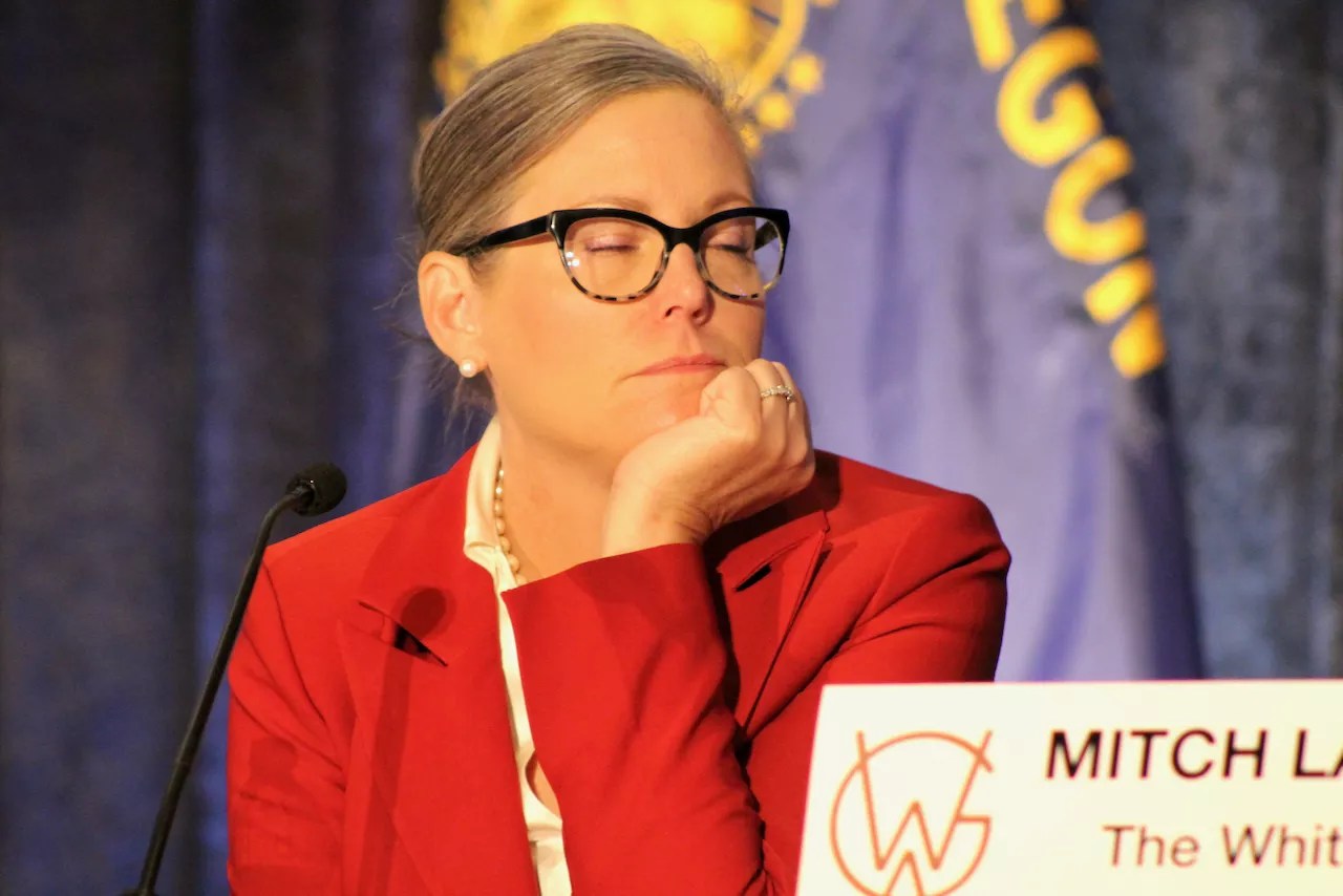 At one point during the discussion, conference chair and Colorado Governor Jared Polis turned to Hobbs and asked if she had any questions or comments. She looked up from her cell phone for a fleeting moment to silently shake her head no.