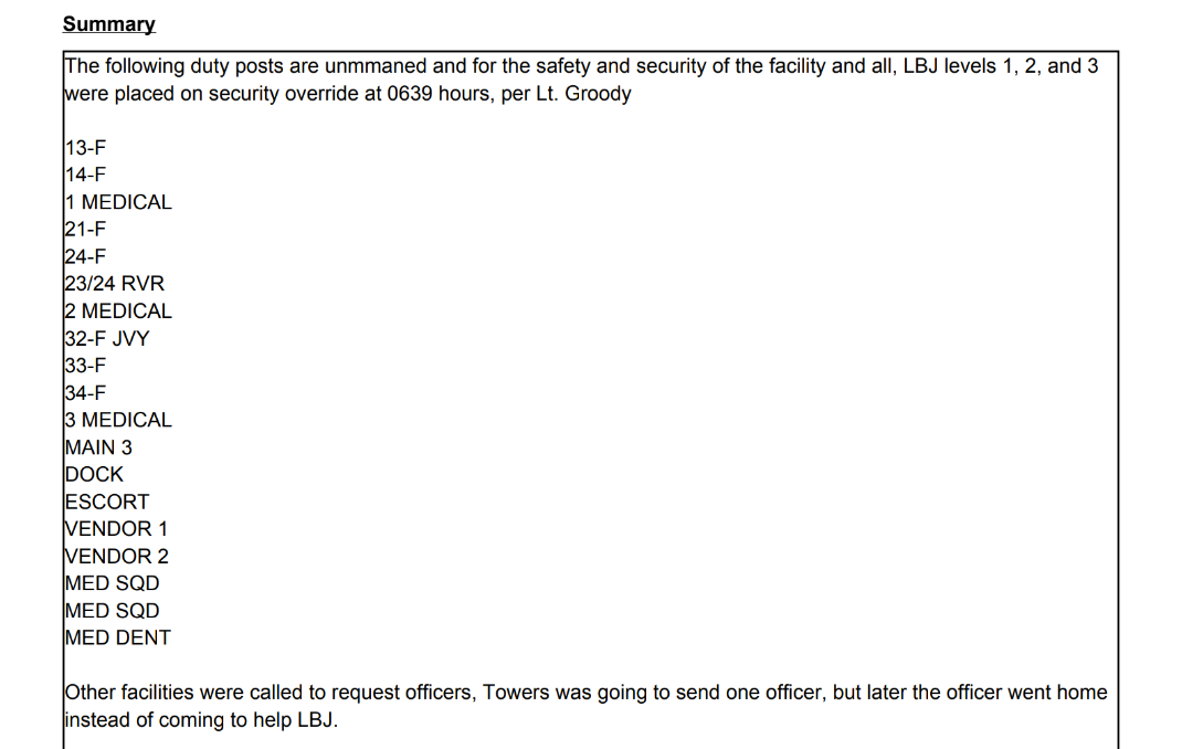 A shift summary showing that 19 posts were left vacant in Lower Buckeye Jail recently.