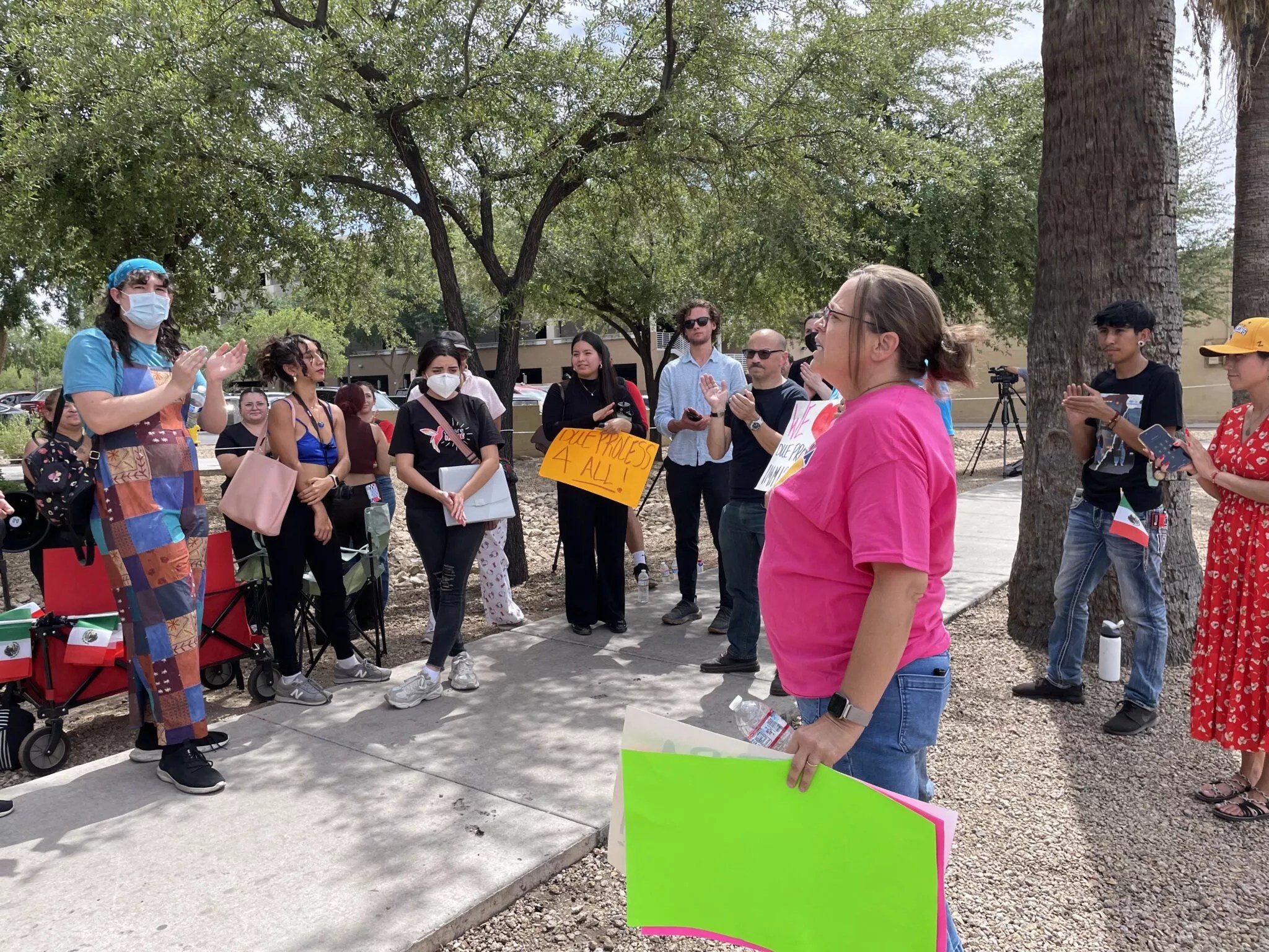 Monica Sandschafer, the Arizona state director for Mi Familia Vota, speaks to the crowd after the day’s court hearings have ended, asking them to return in the following days to help observe and protest against ICE arrests that may occur at the Phoenix Immigration Court.
