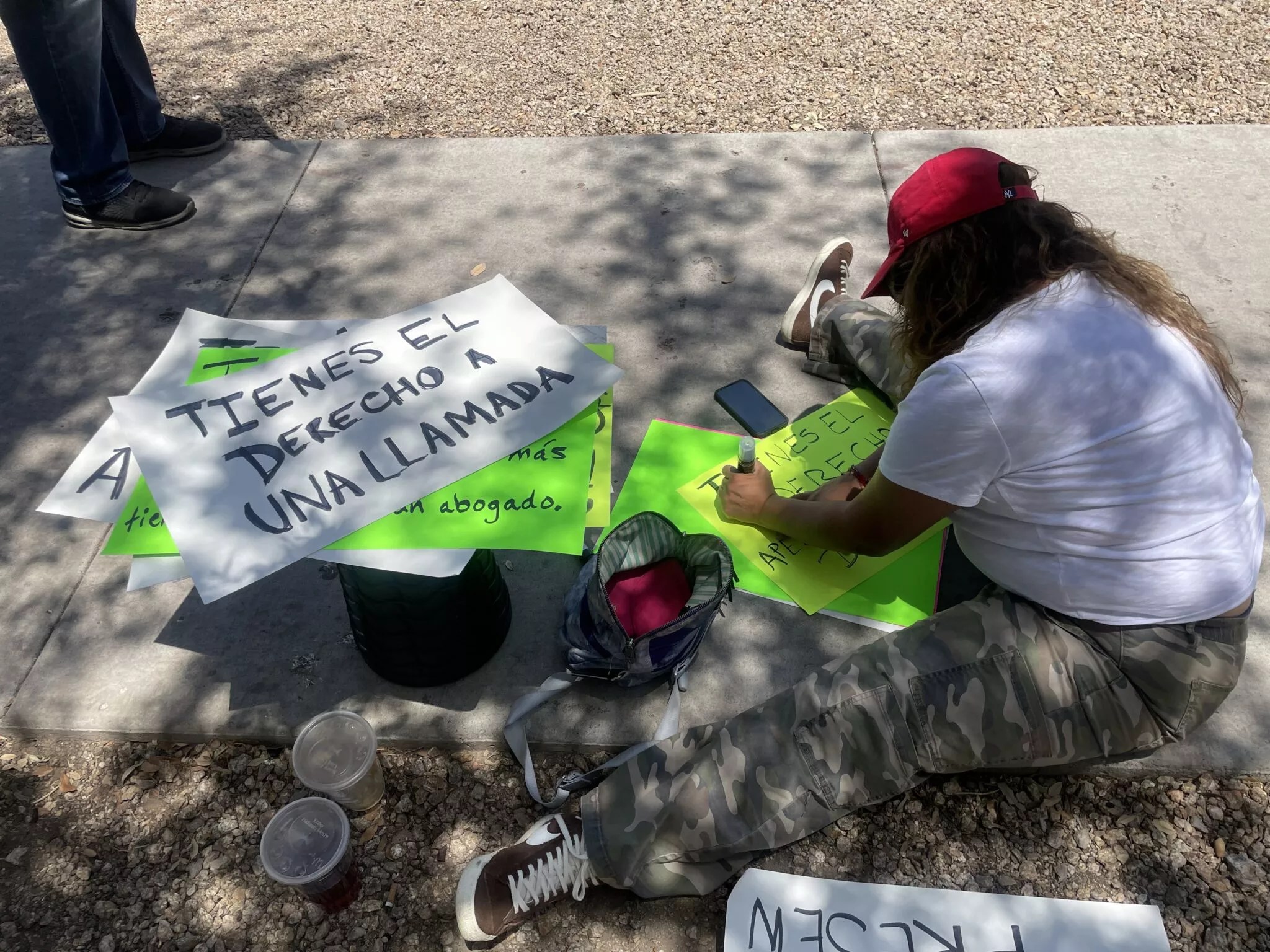 A protester writes signs advising people arriving at the Phoenix Immigration Court of their rights to make a call and appeal their case’s dismissal.