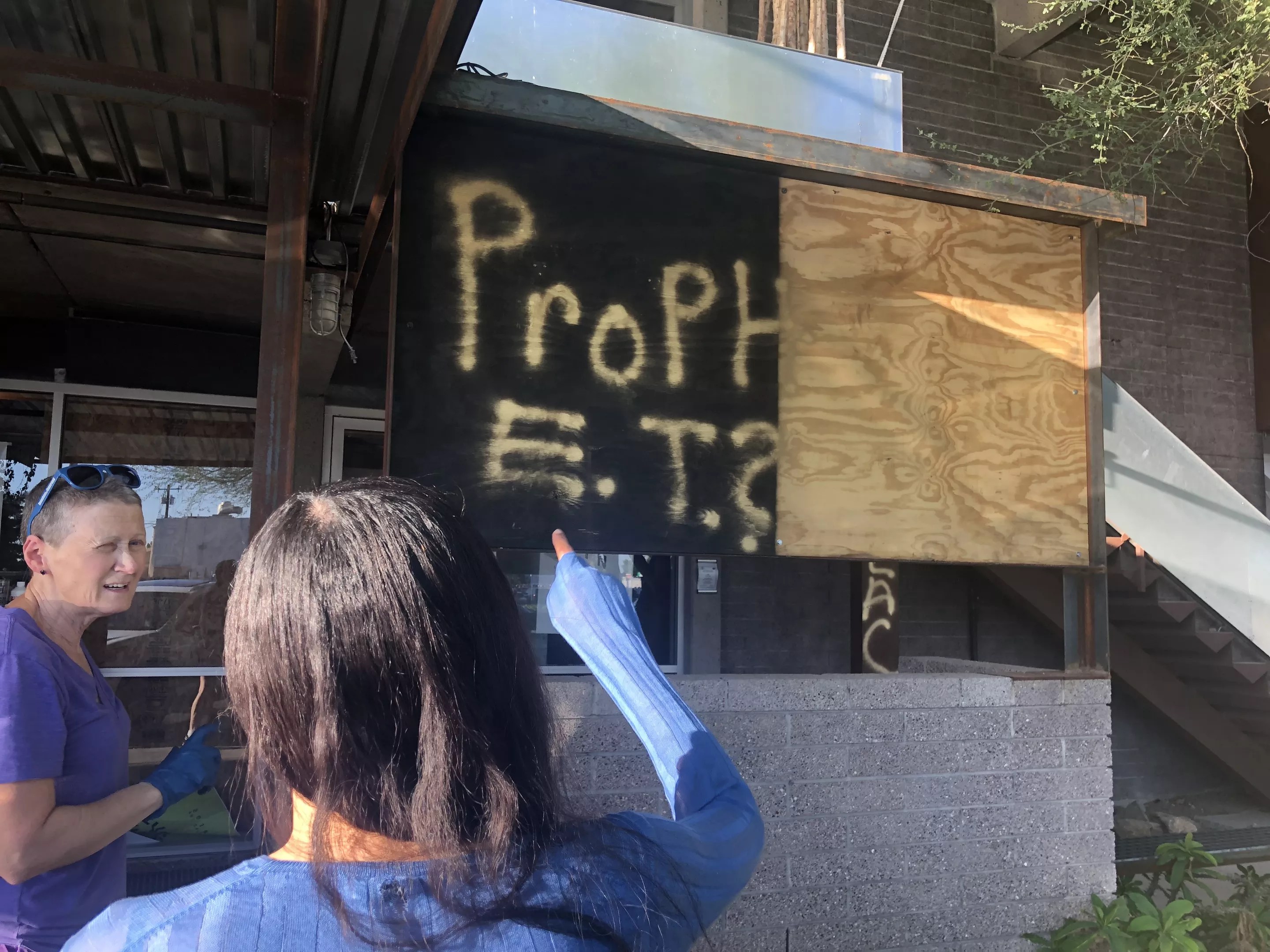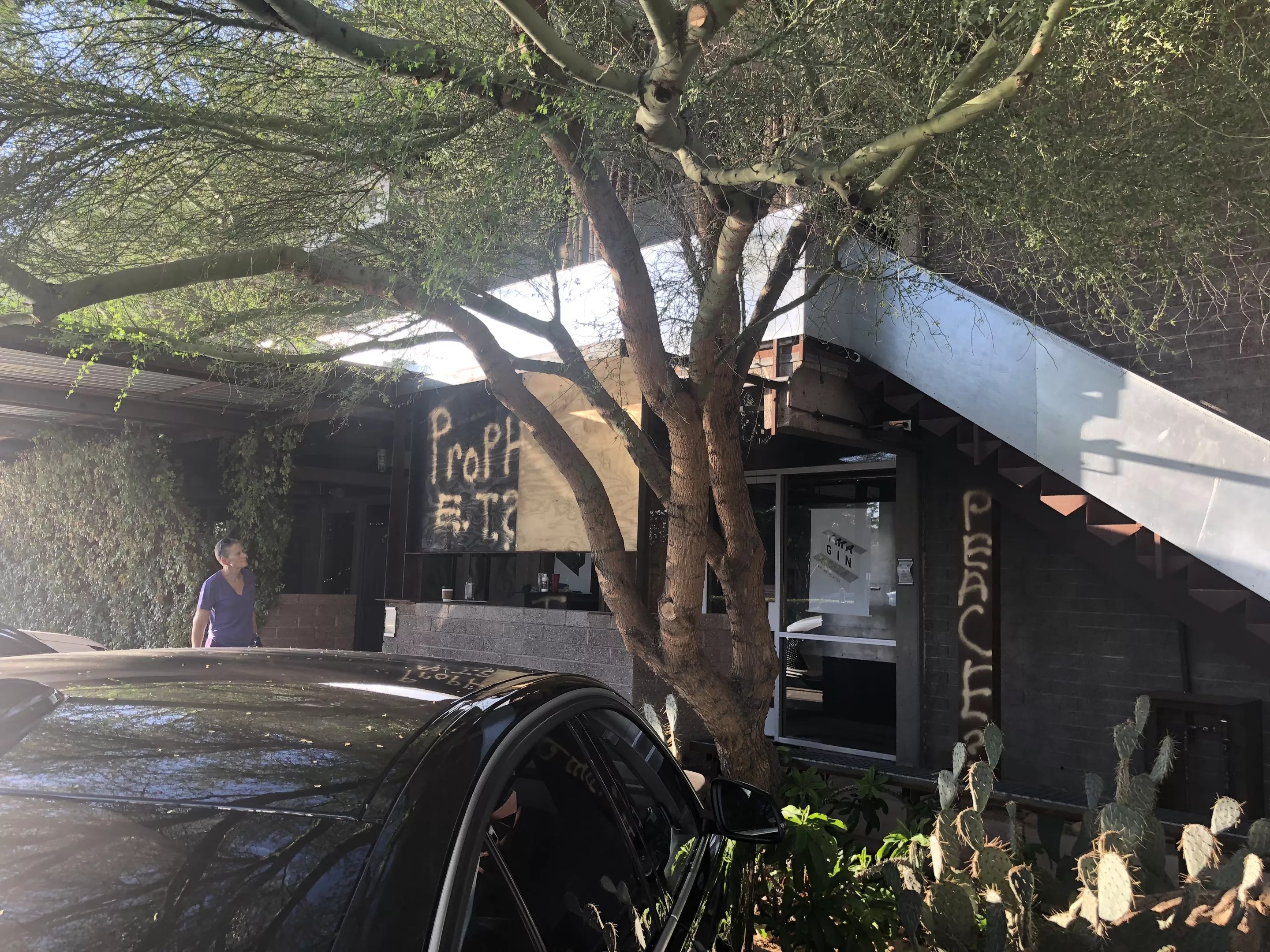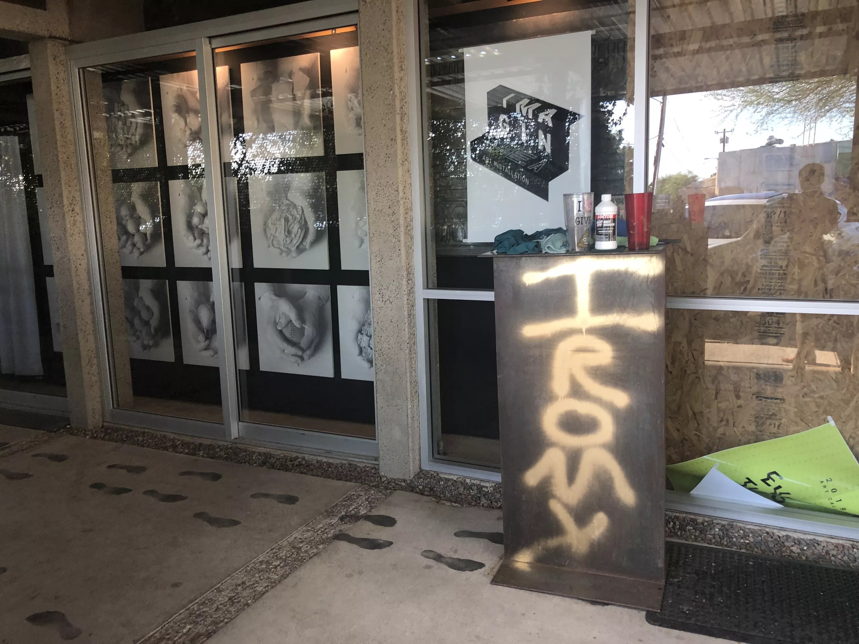 The newly opened Imaginarea, an interactive art space that’s met with controversy following questions about its connection to its former owner, was vandalized Tuesday. Messages were littered across both entrances to the midtown Phoenix venue, and a single gold feather, allegedly from the vandal, was left in a nearby phone booth.