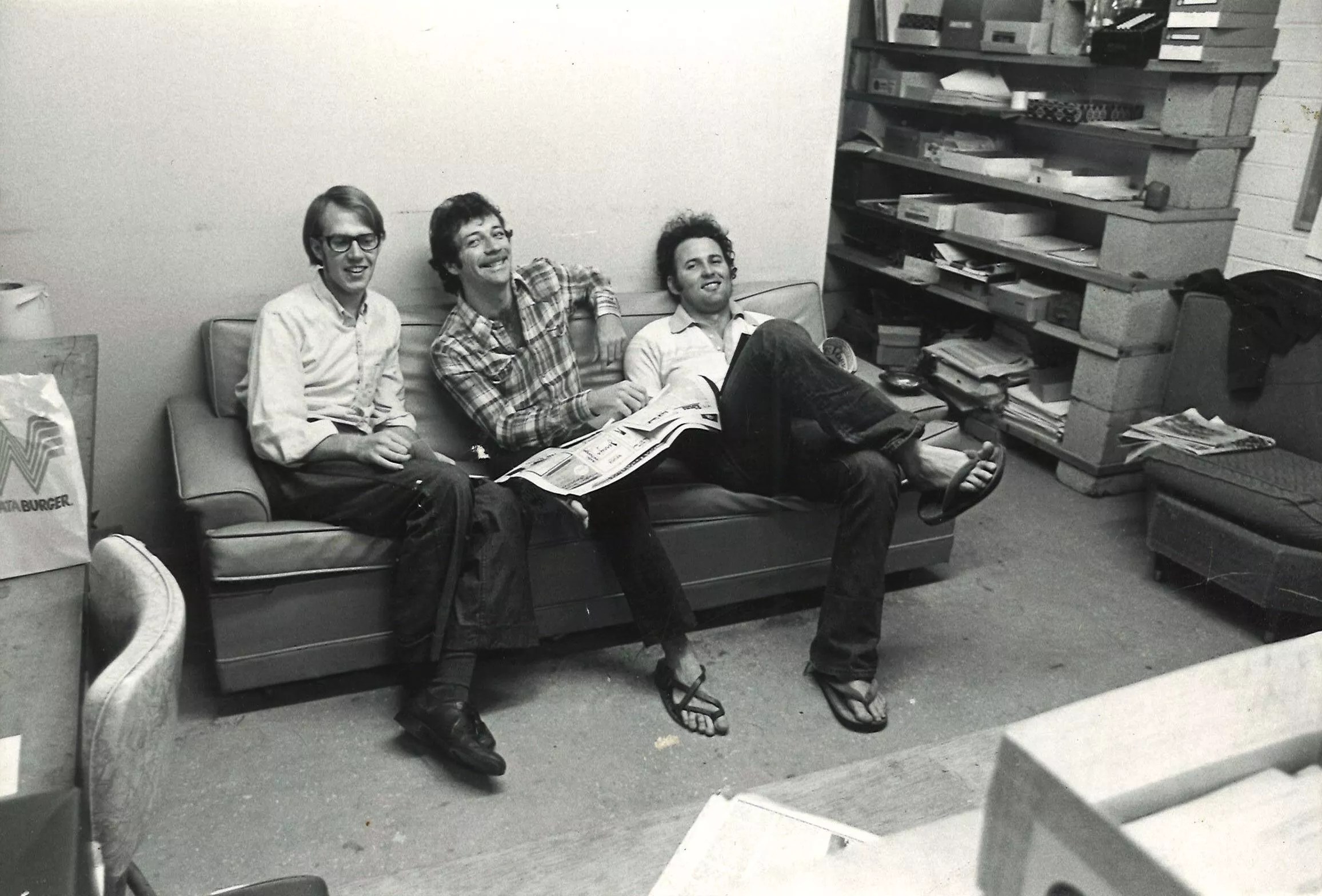 From left, New Times contributor Geoff O’Connell, Michael Lacey and Jim Larkin in 1972 at the paper’s office near Mill Avenue and University Drive in Tempe.