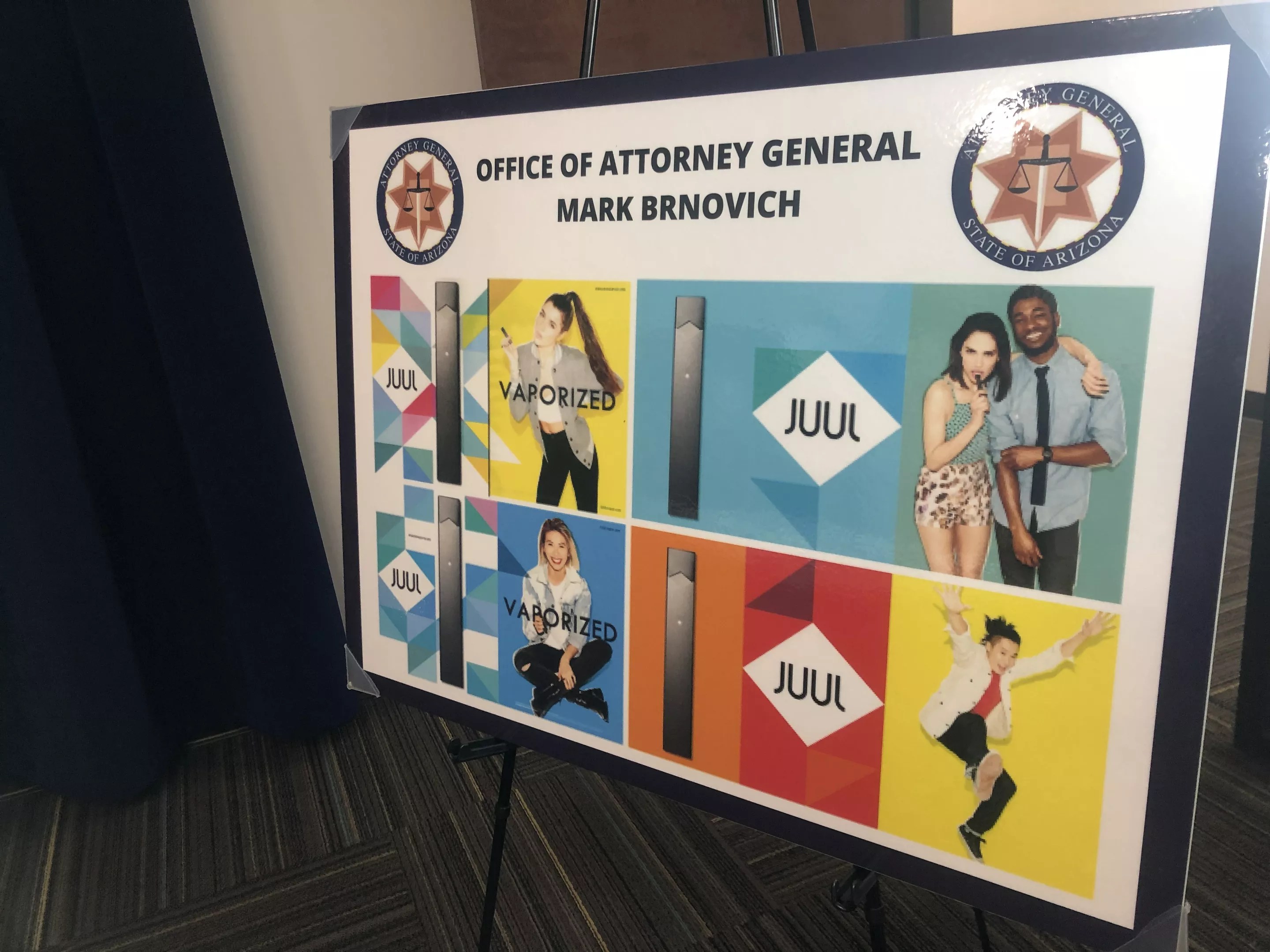 A poster at the attorney general’s press conference shows JUUL advertisements with bright colors and young models, which the state’s lawsuit argues targeted underage users.
