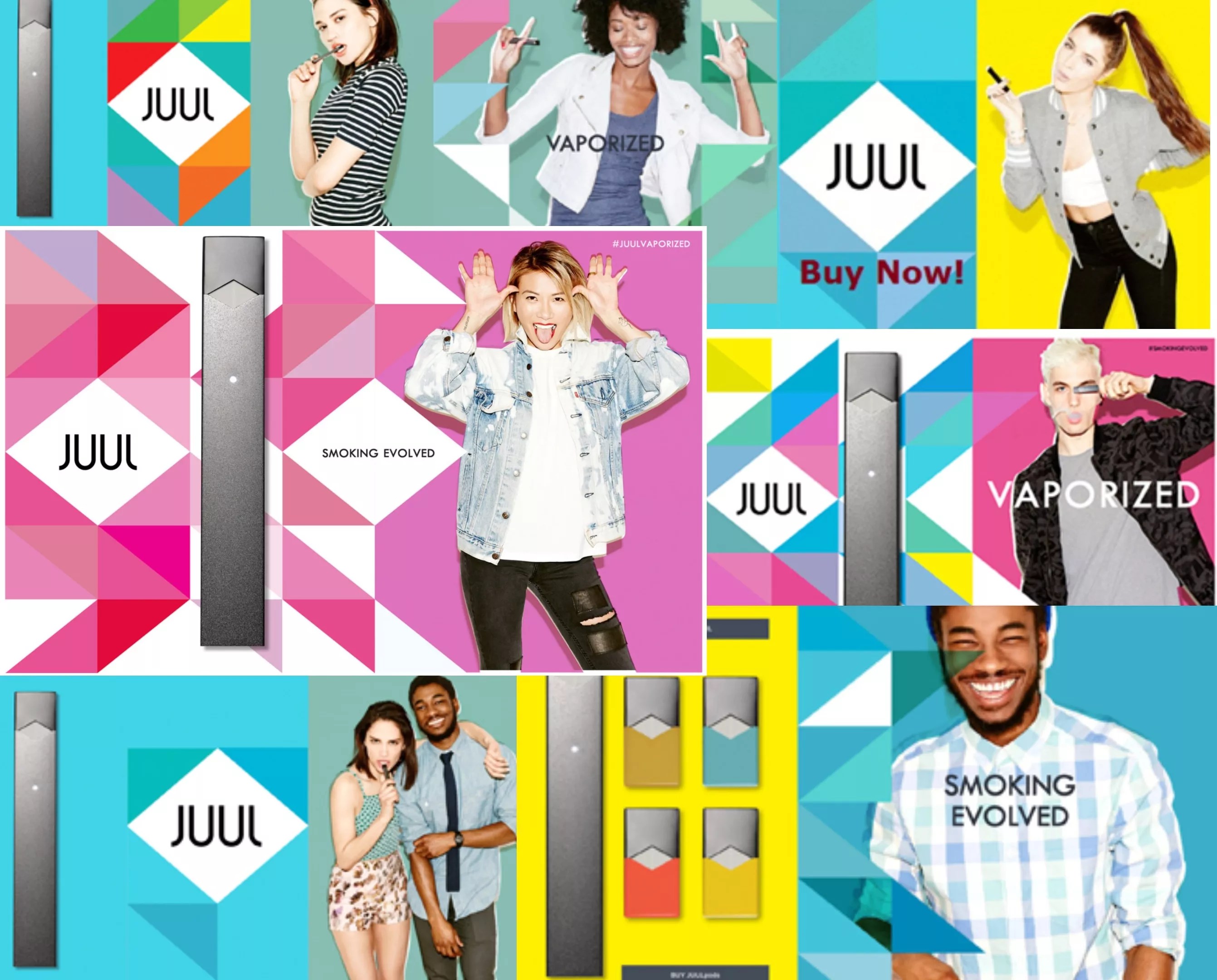 An assortment of Juul ads from a 2015 campaign that a Stanford University study refers to as “patently youth oriented.”