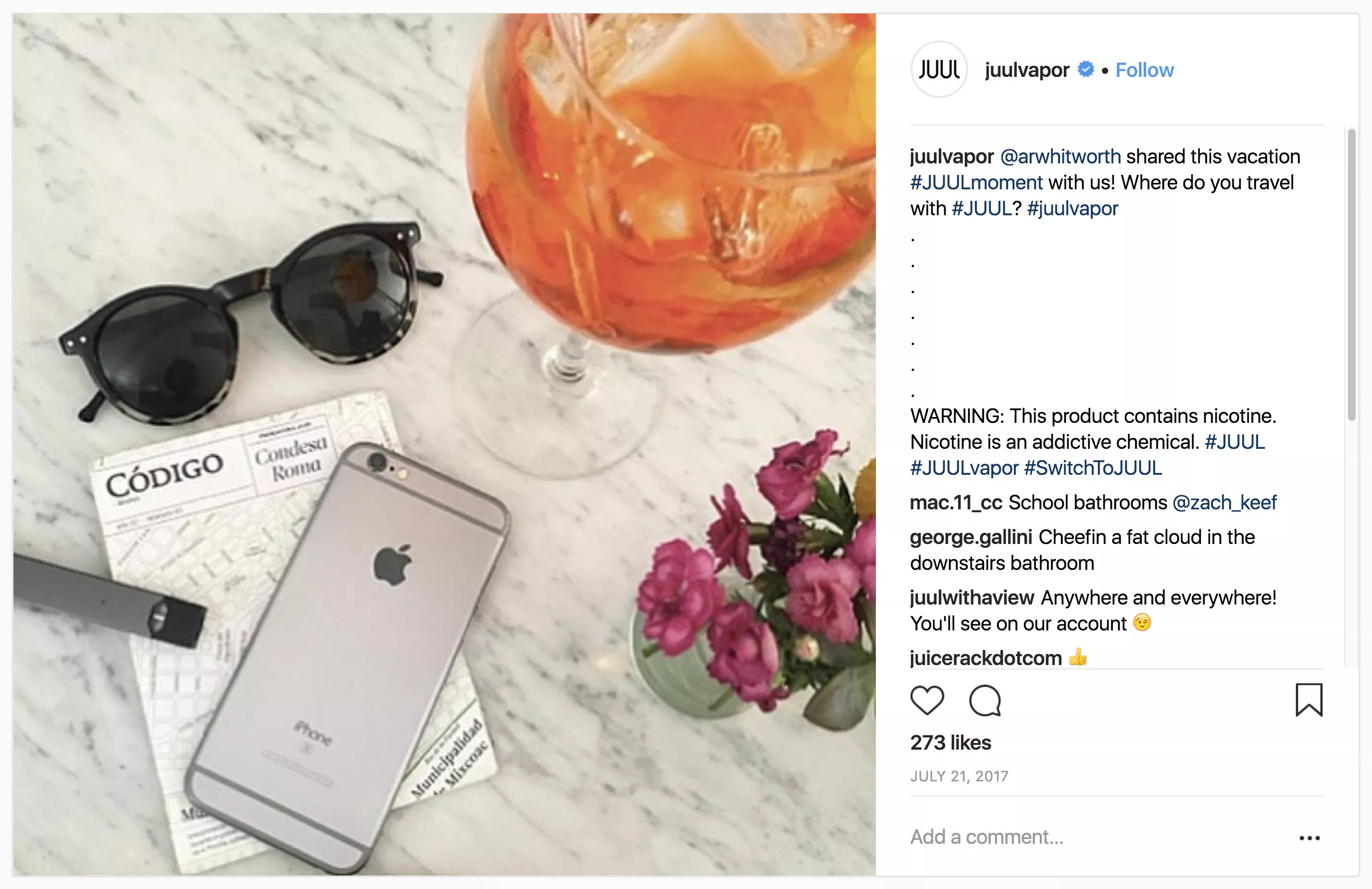 A 2017 Instagram ad poses a Juul next to sunglasses, a cell phone, and a drink, copying popular posts from young social media influencers.