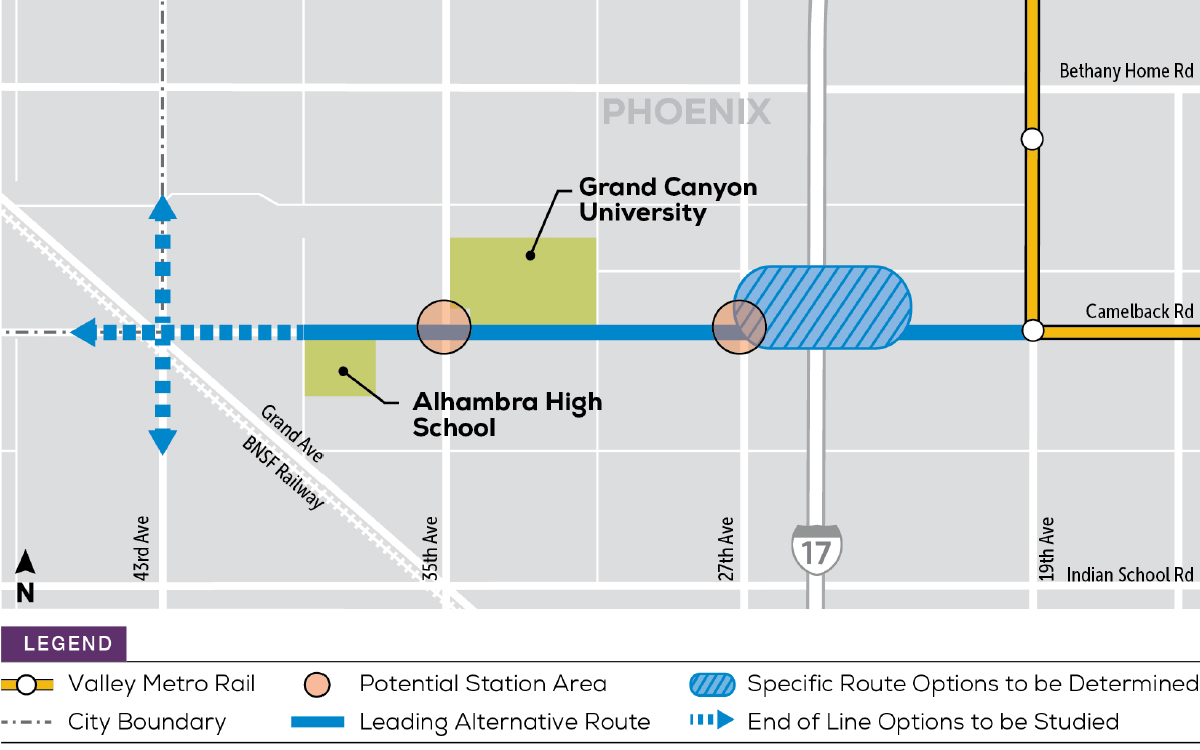 Some quick background: In 2015, Phoenix voters approved a whopping $31 billion in funding to invest in transportation infrastructure, ranging from bike lanes to frequency bus routes, as part of a plan called Transportation 2050. Included in that was funding for an additional 42 miles of light rail track and stations, including a line to west Phoenix. The idea was to extend the existing light rail line on Camelback Road west past Grand Canyon University at North 35th Avenue.