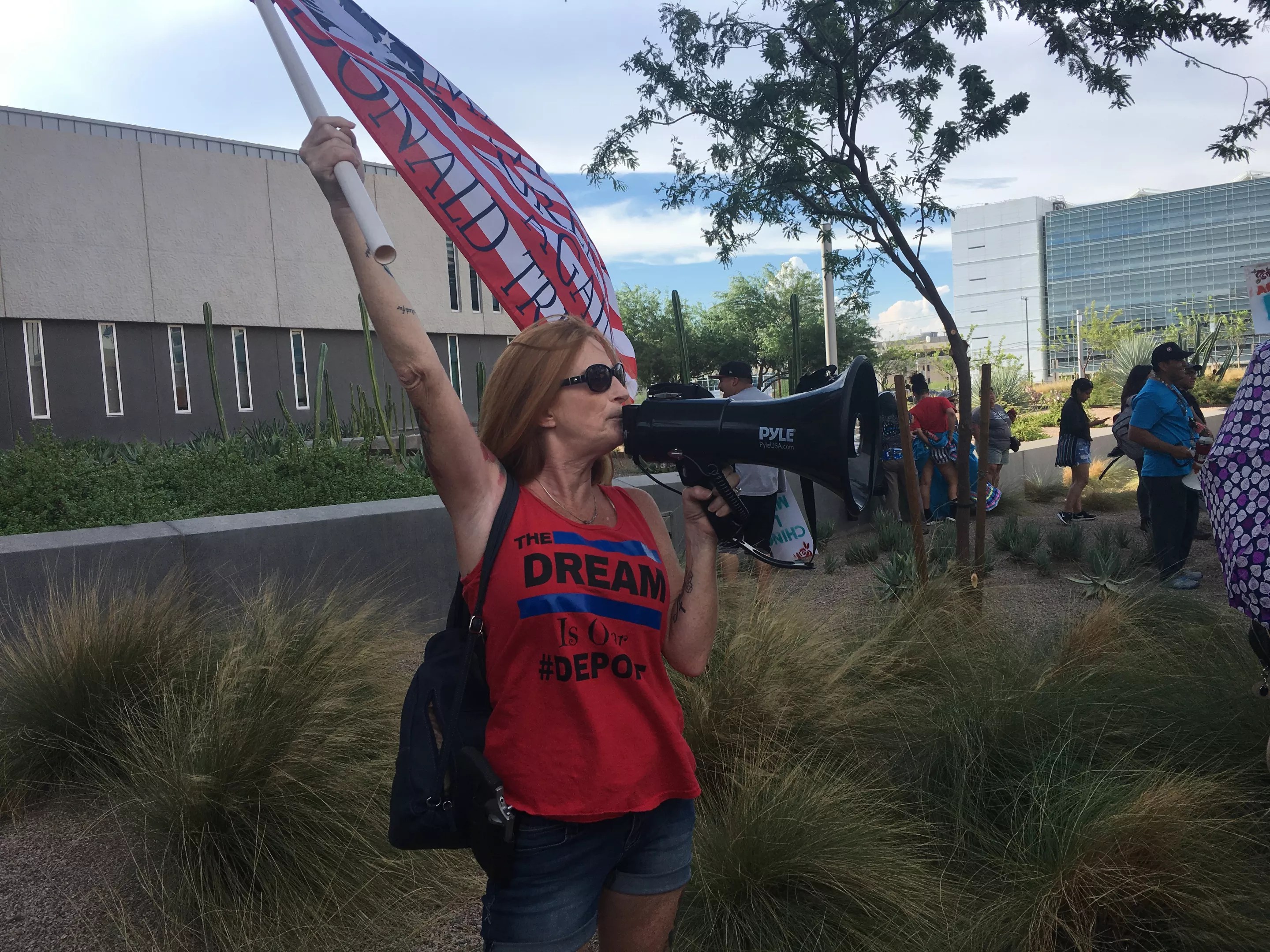 Patriot Movement AZ founder Lesa Antone taunts protesters through a bullhorn.