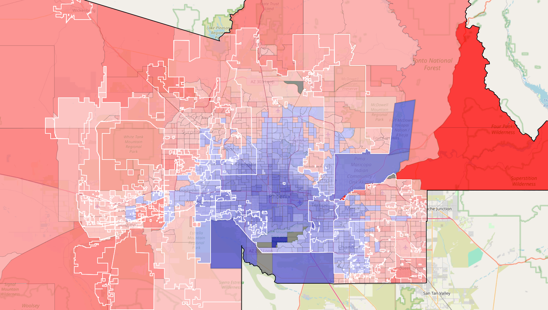 On Cinyc’s website, the map is interactive, allowing you to click specific precincts to see the exact voting breakdown. You can also view maps for other races — but not the presidential race — such as several of Arizona’s congressional races, mayoral races in Mesa and Scottsdale, and countywide races such as sheriff and recorder.